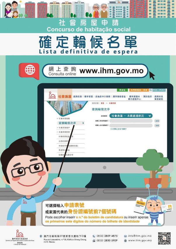Os candidatos podem consultar a sua ordenação na lista de candidatura a habitação social ou o motivo da exclusão através da página electrónica do IH (www.ihm.gov.mo), na coluna de Consulta, inserindo o número do boletim de candidatura ou os primeiros sete dígitos do bilhete de identidade do representante do agregado familiar. Simultaneamente, as listas encontram-se afixadas no parque de estacionamento da antiga sede do IH (Travessa Norte do Patane, n.º 102, Ilha Verde, Macau), a partir de hoje e até ao dia 28 de Fevereiro, podendo ser consultadas de Segunda a Domingo, das 9H00 às 17H45, sem interrupção durante a hora do almoço.