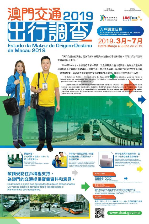 Pelo Estudo da Matriz de Origem-Destino de Macau são recolhidos dados básicos e essenciais para a elaboração da política de trânsito e respectivo planeamento. Os primeiros dois estudos desta natureza foram realizados em 2009 e 2014. Findos 5 anos desde o último estudo, a Direcção dos Serviços para os Assuntos de Tráfego (DSAT) decidiu realizar, entre Março e Julho de 2019, um novo estudo para actualização de dados, permitindo a renovação do planeamento e medidas de gestão dos transportes e melhorando a qualidade de deslocação dos habitantes.