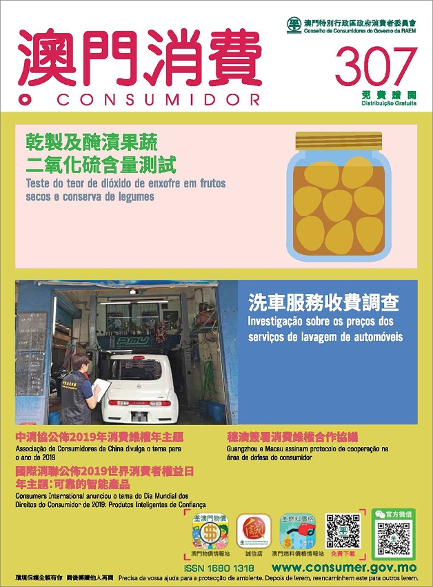 A revista “O Consumidor” n.º 307 publicou os resultados da detecção do dióxido de enxofre em frutos secos e conserva de legumes, realizada pelo Conselho de Consumidores (CC) em cooperação com o Departamento de Segurança Alimentar do Instituto para os Assuntos Municipais (DSA), bem como o relatório da investigação sobre o preço dos serviços de lavagem de automóveis. Os consumidores agoram podem consultar os respectivos relatórios na página electrónica do CC e na sua conta de WeChat.
