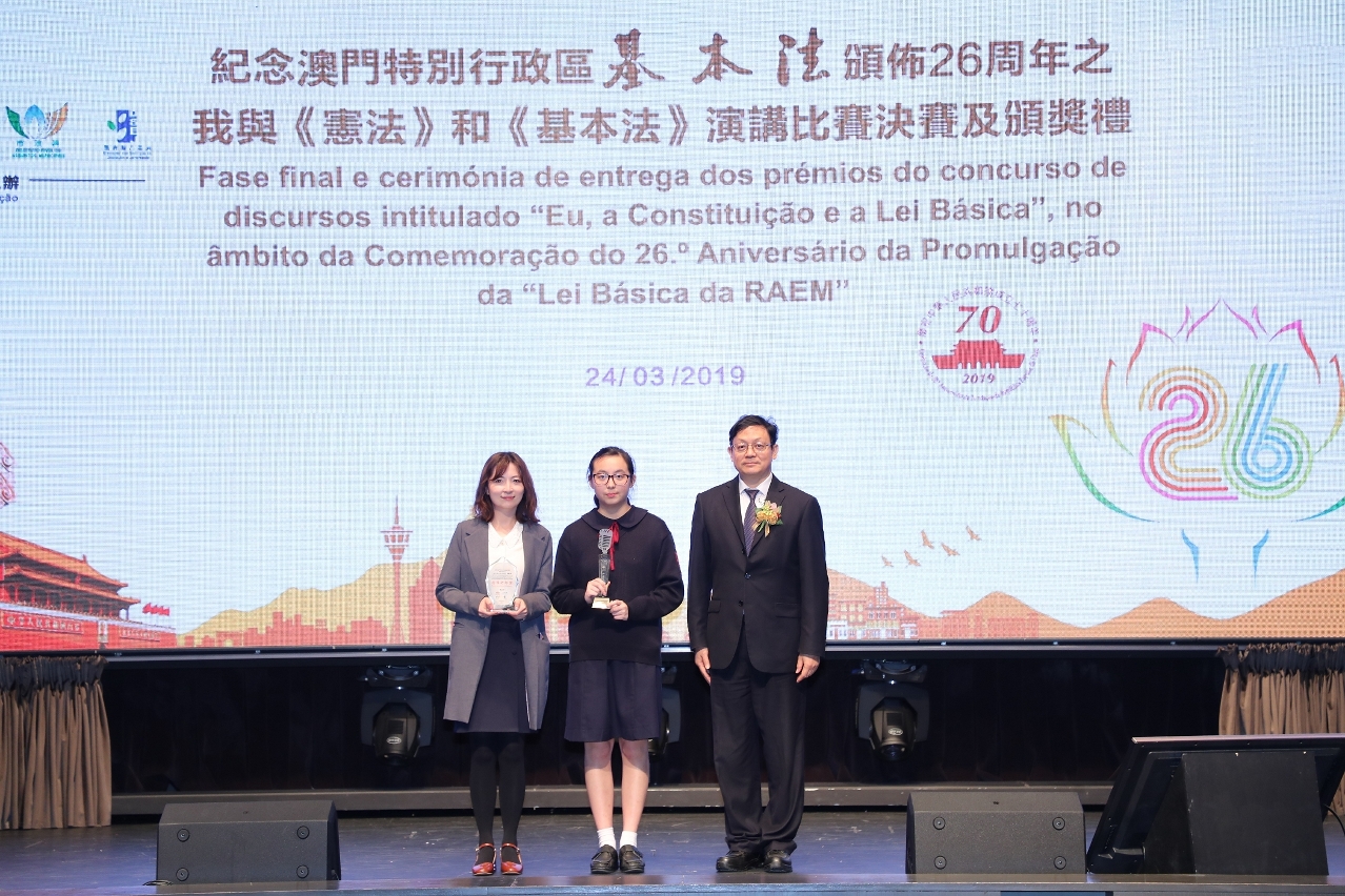 Por ocasião do 70.º Aniversário da implantação da República Popular da China e do 20.º Aniversário do Retorno de Macau à Pátria foi organizado, conjuntamente, pela Associação de Divulgação da Lei Básica de Macau, pela Direcção dos Serviços de Assuntos de Justiça (DSAJ), pelo Instituto para os Assuntos Municipais (IAM) e pela Direcção dos Serviços de Educação e Juventude (DSEJ), e realizado pela Associação “Eu Sou Um Orador de Macau”, o concurso de discursos “Eu, a Constituição e a Lei Básica”, para Comemoração do 26.º Aniversário da Promulgação da Lei Básica da RAEM”, cuja fase final e cerimónia de entrega de prémios foram realizadas, com sucesso, no dia 24 de Março, no auditório da Escola São Paulo.