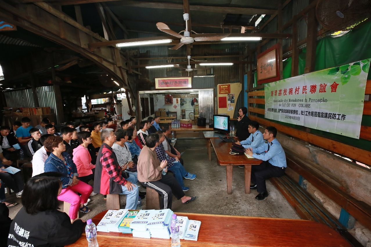 Durante a tarde do dia 3 de Abril, a Escola Superior das Forças de Segurança de Macau, em conjunto com os Serviços de Polícia Unitários e o Instituto de Acção Social de Macau, realizaram, no Café Hon Kei em Coloane, uma sessão de esclarecimento e de divulgação do "Plano de evacuação das zonas baixas em situações de “Storm Surge” durante a passagem de tufões”, na qual explicaram aos cidadãos organizados pela Associação dos Moradores da Povoação de Lai Chi Vun de Coloane, os conteúdos do referido plano de evacuação e as observações a seguir. Os conteúdos desta sessão de esclarecimento e de divulgação são divididos principalmente em três partes: 1) conhecimentos sobre a prevenção de desastres e esclarecimento do plano de evacuação; 2) os representantes do Instituto de Acção Social explicaram o funcionamento dos centros de abrigo nas zonas; 3) explicaram e entregaram os rádios de comunicação destinados exclusivamente à protecção civil à Associação dos Moradores da Povoação de Lai Chi Vun de Coloane.