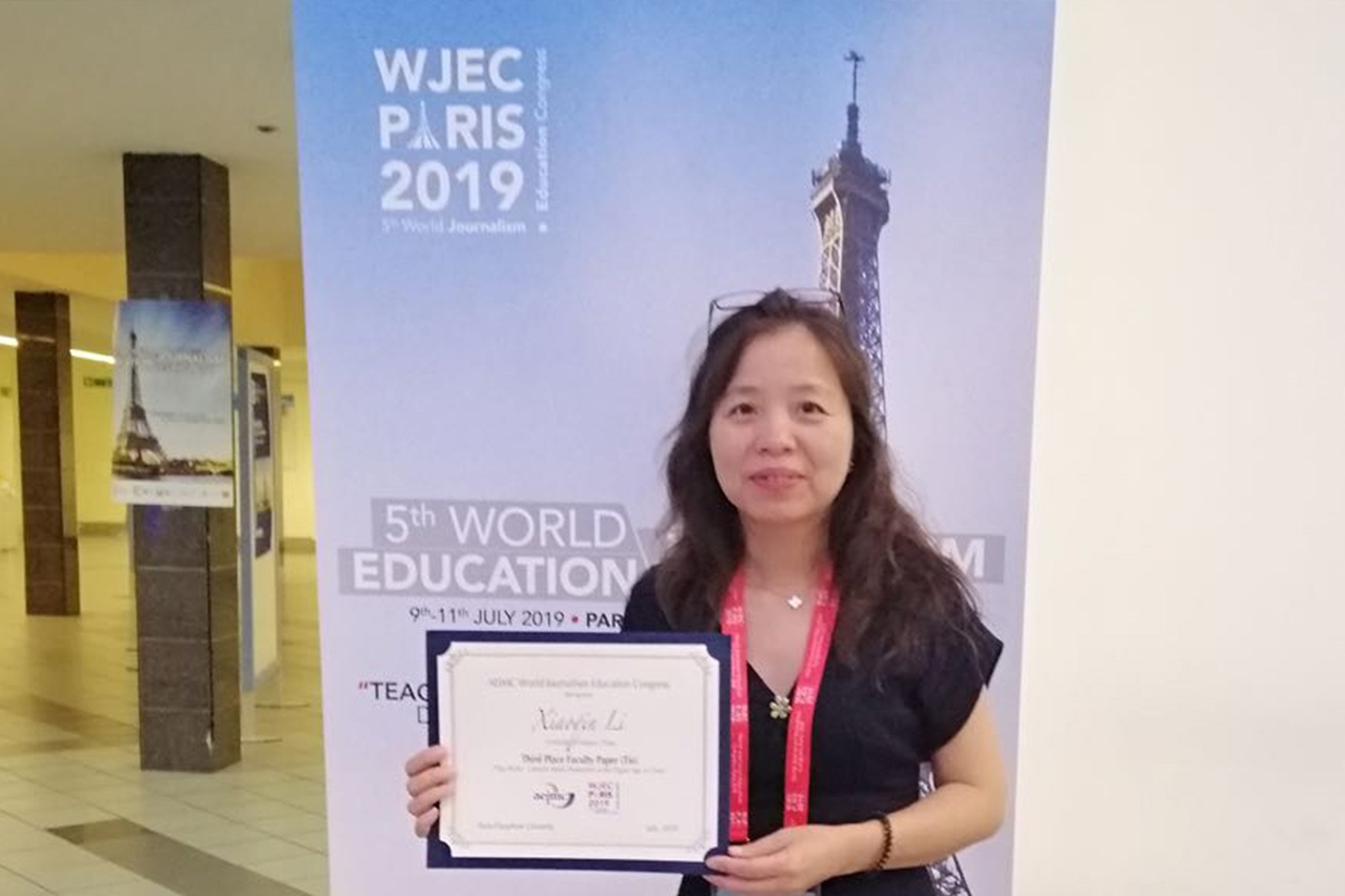 Dr Li Xiaoqin, assistant professor from the Department of Communication, Faculty of Social Sciences, University of Macau (UM), received a third-place award in the faculty paper category in a special research competition organised by the Association for Education in Journalism and Mass Communication (AEJMC). Dr Li received the award at the Fifth World Journalism Education Congress (WJEC), which was held earlier this month in Paris. She was the only scholar from outside the United States to receive an award at the event.