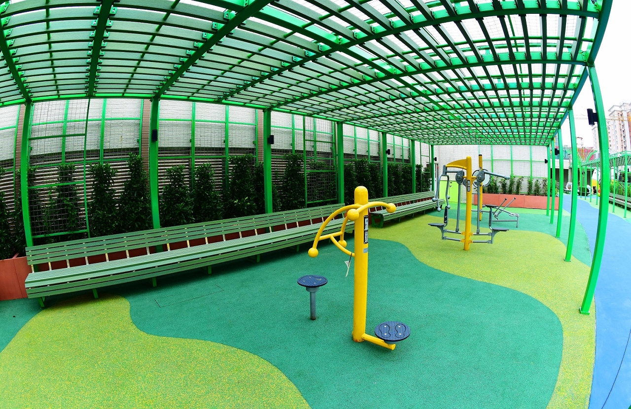 Zona de manutenção física para adultos: instalados ao longo do trilho de caminhada, os vários conjuntos de equipamentos de manutenção física para adultos podem ser utilizados simultaneamente por várias pessoas, acompanhados por abrigos solares equipados com suportes para plantas e bancos de assento, a fim de proporcionar aos moradores instalações da qualidade para exercício físico.