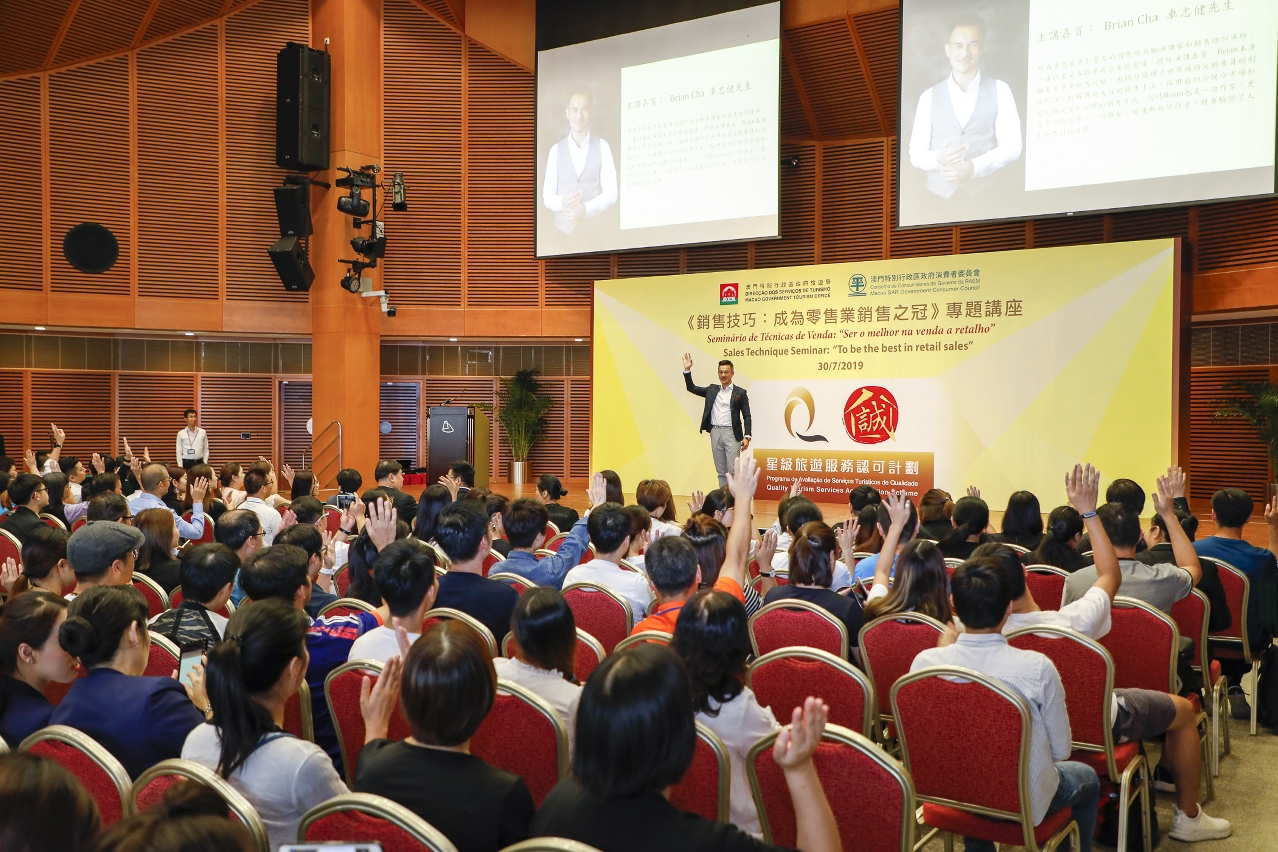 O Seminário de Técnicas de Venda: “Ser o melhor na venda a retalho” foi o primeiro seminário co-organizado pela DST e pelo CC após o lançamento do “Programa de Avaliação de Serviços Turísticos de Qualidade” vinculado ao “Sistema de Lojas Certificadas”. O orador, Brian Cha, foi convidado, no ano passado, para um workshop da série “Mentores Célebres” organizada pela DST em conjunto com a indústria turística que foi muito bem acolhida. Assim, este ano o orador foi novamente convidado a partilhar as suas dicas que ultrapassem as ideias tradicionais de venda. Brian Cha através das suas ricas experiências em venda e as suas técnicas habilidosas que dominam a mentalidade dos clientes, no seminário, através de discursos vivos e interessantes, partilhou entre outras técnicas úteis e aspectos principais de venda a retalho, como por exemplo, compreender as razões de compra dos clientes, estabelecer rapidamente confiança mútua, e conduzi-los a fazer compras repetidas. Os operadores do sector de venda a retalho que participaram no seminário auscultaram com atenção e ficaram impressionados.