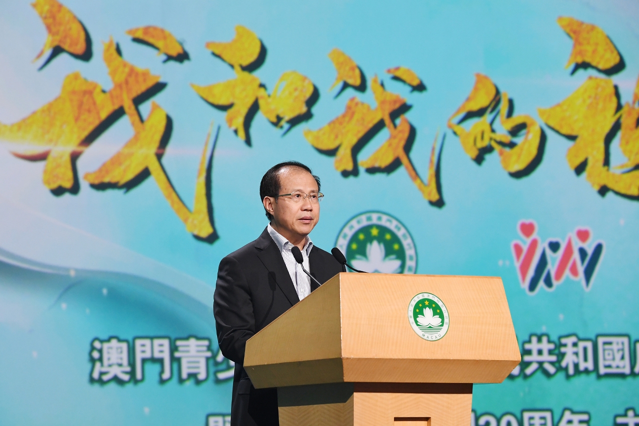 Chui Sai On salientou que, nos últimos anos, sob orientação do Presidente Xi Jinping e contando com o forte apoio do Governo Central, o Governo da Região Administrativa Especial de Macau (RAEM) tem-se empenhado no reforço de acções de planeamento e coordenação com as secretarias do governo e seus serviços públicos, numa conjugação de esforços com os diversos sectores sociais, para criar melhores condições para o crescimento, formação e sucesso dos jovens, ao mesmo tempo zelando pela transmissão geracional da tradição honrosa do patriotismo e do amor a Macau. Este ano, o Governo da RAEM, o Gabinete de Ligação do Governo Central na RAEM e a Comissão Organizadora de Actividades das Diversas Associações de Juventude de Macau colocaram em marcha diversas actividades a propósito da «dupla celebração», nomeadamente o programa da visita de aprendizagem «Caminhar juntos na Nova Era», recentemente concluído com sucesso, e a Sessão Temática «Eu e a minha Pátria».