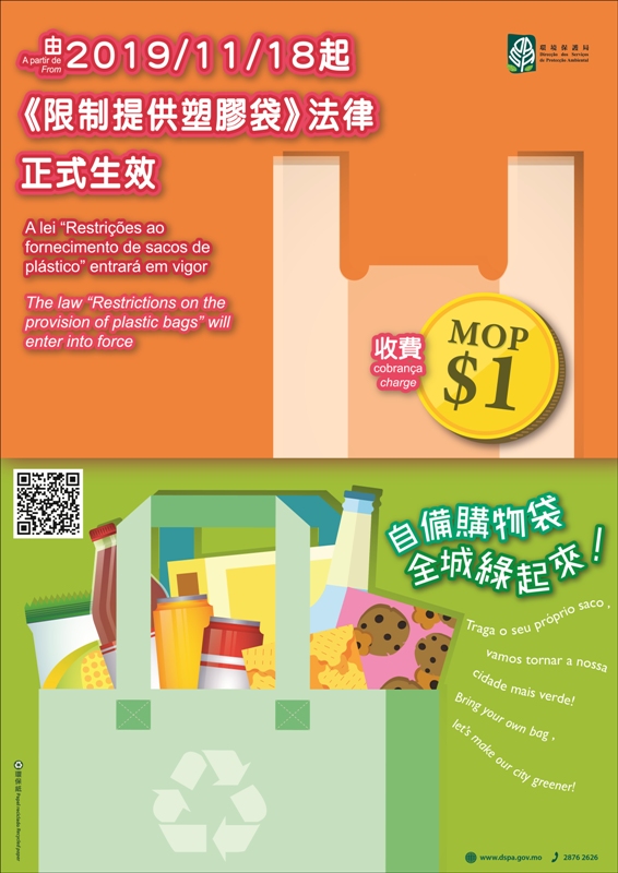 Mais, de acordo com a lei, durante os dois primeiros anos de vigência da presente lei, nos estabelecimentos de comércio a retalho, em lugar visível, devem estar expostos os materiais de divulgação sobre o fornecimento a título oneroso de sacos de plástico, aprovados pela DSPA. Os materiais podem ser descarregados através da página electrónica da DSPA (www.dspa.gov.mo), sendo fornecidos também na DSPA (Estrada de D. Maria II, 32-36, Edifício CEM, 1.º andar, Macau) e no seu Centro Ambiental Alegria (a título experimentar), cujo endereço pode ser consultado na página electrónica.