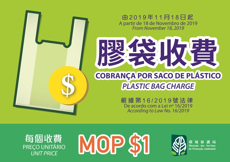 Tendo em conta que a Lei n.º 16/2019 “Restrições ao fornecimento de sacos de plástico” vai entrar em vigor a partir do dia 18 de Novembro do corrente ano, o Despacho do Chefe do Executivo n.º 143/2019, publicado hoje no Boletim Oficial da Região Administrativa Especial de Macau, prevê que seja cobrado o valor de uma pataca por saco de plástico. As informações relativas aos sacos de compras, feitos de plástico e regulados pela lei, já estão disponíveis na página electrónica da Direcção dos Serviços de Protecção Ambiental (DSPA) (http://www.dspa.gov.mo/plasticbagcharge.aspx), para referência dos estabelecimentos de comércio e cidadãos.