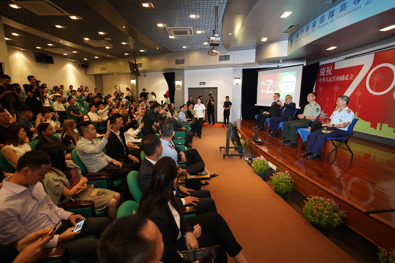 As forças e serviços da área para a segurança do Governo da RAEM co-realizaram na manhã do dia 21 do mês corrente o evento “A área para a segurança comemora o 70.º aniversário da implementação da República Popular da China em diálogo sincero entre os jovens e o Secretário para a Segurança”. 170 jovens de diversas associações de Macau e os representantes das forças e serviços da área da segurança do Governo da RAEM celebraram em conjunto o 70.º aniversário da Nova China na Escola Superior das Forças de Segurança Pública de Macau. Na sessão de diálogo sincero com os jovens, o Secretário para a Segurança transmitiu-lhes a mensagem de respeito pelo Estado de direito, da boa situação de paz e tranquilidade que se usufrui em Macau e da importância de, conjuntamente com os diferentes sectores da sociedade, todos actuarem como guardiões da segurança geral do País e de Macau.