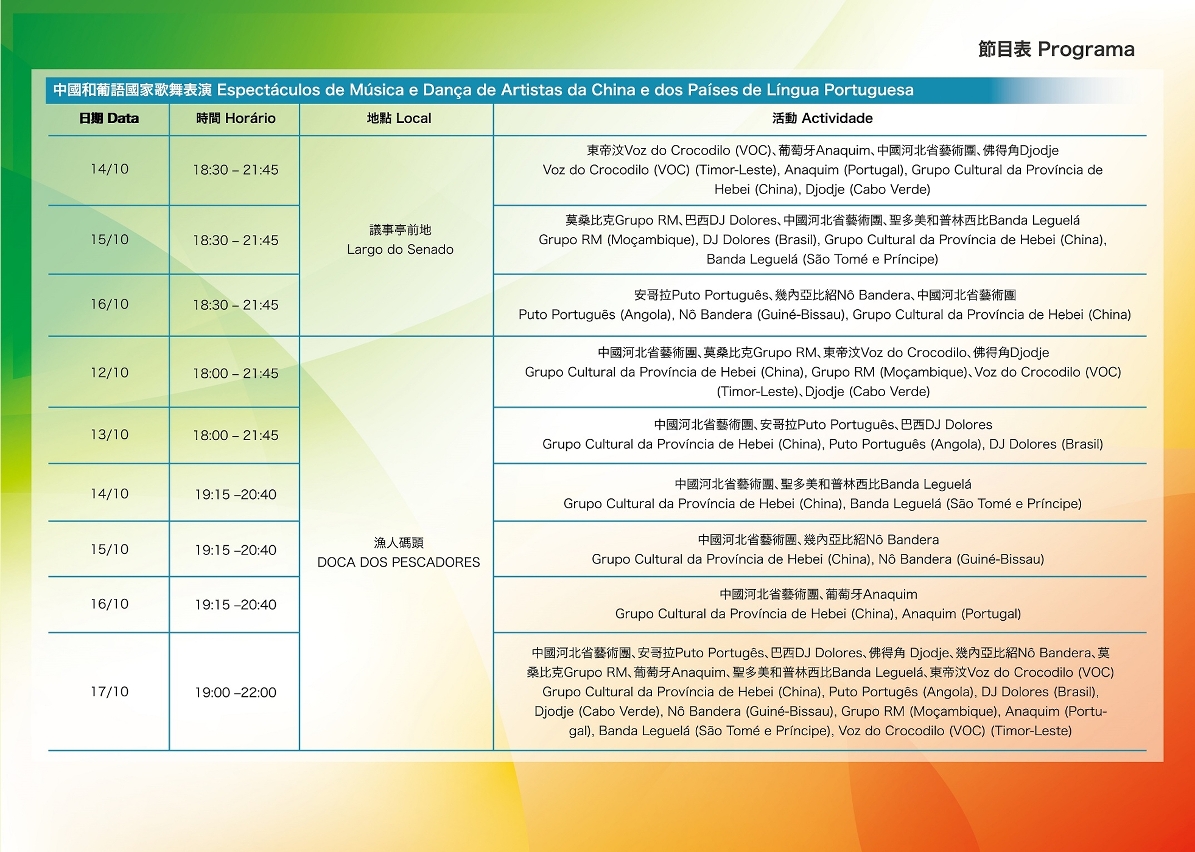 - Nos “Espectáculos de Música e Dança de Artistas da China e dos Países de Língua Portuguesa” serão convidados os grupos de música e dança da Província de Hebei da China e dos Países de Língua Portuguesa para oferecer ao público uma série de espectáculos animados no Largo de Senado e na Doca dos Pescadores de Macau, manifestando a singularidade das artes performativas da China e dos Países de Língua Portuguesa.