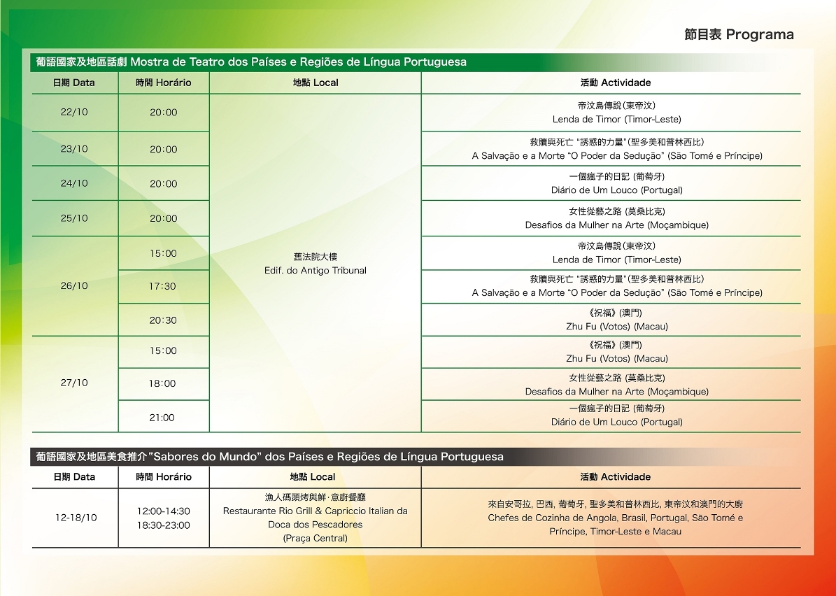 - A “Mostra de Teatro” no Edifício do Antigo Tribunal contará com os espetáculos dos grupos artísticos provenientes de Moçambique, Portugal, São Tomé e Príncipe, Timor-Leste e Macau, proporcionando uma série de espectáculos sensacionais únicos.