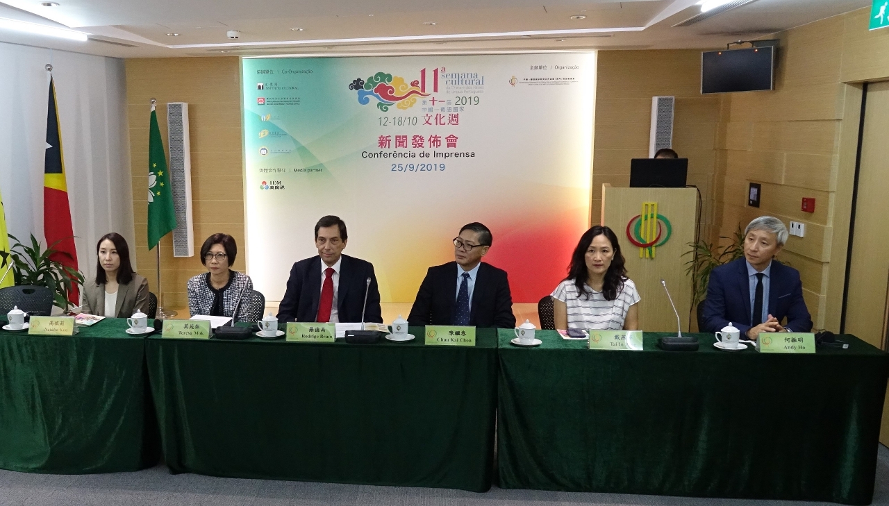 A 11ª Semana Cultural da China e dos Países de Língua Portuguesa, organizada pelo Secretariado Permanente do Fórum para a Cooperação Económica e Comercial entre a China e os Países de Língua Portuguesa (Macau), será realizada entre os dias 12 e 18 de Outubro de 2019. O evento contará com 5 actividades de relevo, nomeadamente Espectáculos de Música e Dança de Artistas da China e dos Países de Língua Portuguesa, Exposições de Artes Plásticas dos Artistas da China e dos Países de Língua Portuguesa, Mostra de Teatro dos Países e Regiões da Língua Portuguesa, Feira de Artesanato da China e dos Países de Língua Portuguesa, bem como os “Sabores do Mundo” dos Países de Língua Portuguesa. Para o efeito, o organizador deste evento, o Secretariado Permanente do Fórum de Macau, realizou uma Conferência de Imprensa no dia 25 de Setembro na Sala Multifuncional, que contou com a participação do Secretariado-Geral Adjunto, Dr. Rodrigo Brum e a Coordenadora do Gabinete de Apoio, Dr.ª Mok Iun Lei, os quais apresentaram os métodos de preparação desta edição.