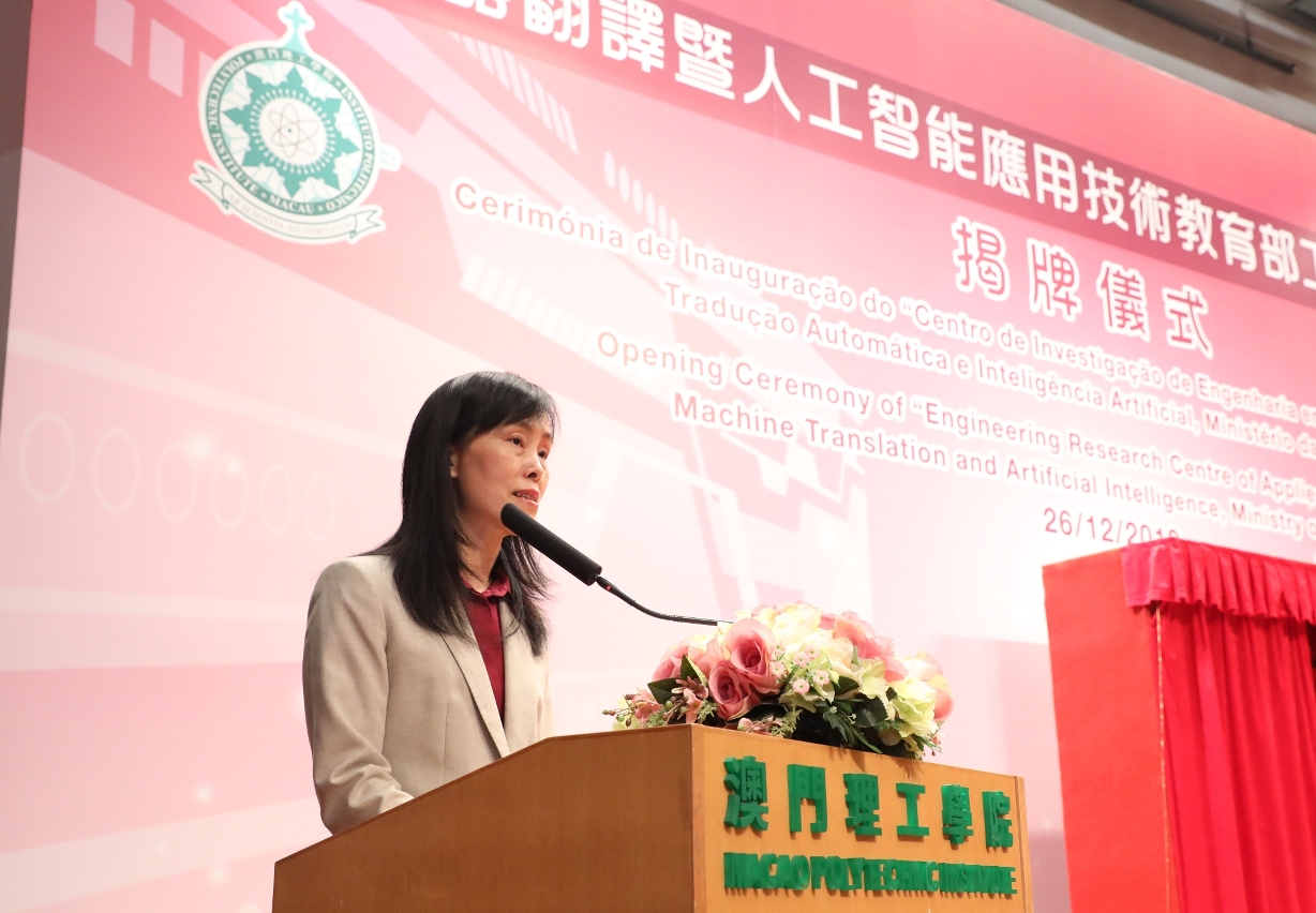 Este ano celebra-se o 70.º Aniversário da Fundação da República Popular da China e o 20.º Aniversário do Retorno de Macau à Pátria. Nesta ocasião de dupla celebração, o Instituto Politécnico de Macau (IPM), com o forte apoio do Governo da Região Administrativa Especial de Macau (RAEM) e do Gabinete de Ligação do Governo Popular Central na RAEM, foi oficialmente autorizado, pelo Ministério da Educação da República Popular da China (RPC), a estabelecer o “Centro de Investigação de Engenharia em Tecnologia Aplicada à Tradução Automática e Inteligência Artificial, Ministério da Educação”. A grandiosa cerimónia de inauguração deste Centro realizou-se no dia 26 de Dezembro, às 15:00, no Auditório do IPM, e contou com a presença dos seguintes convidados de honra: Vice-Ministro da Educação e Presidente da Comissão Linguística da RPC, Dr. Tian Xuejun, Secretária para os Assuntos Sociais e Cultura do Governo da RAEM, Dra. Ao Ieong U, Subdirector do Gabinete de Ligação do Governo Popular Central na RAEM, Dr. Luo Yonggang, Directora do Gabinete para os Assuntos Hong Kong, Macau e Taiwan do Ministério da Educação, Dra. Liu Jin, Director da Direcção dos Serviços do Ensino Superior do governo da RAEM, Dr. Sou Chio Fai e Presidente do Instituto Politécnico de Macau, Prof. Doutor Im Sio Kei. Estiveram ainda presentes na Cerimónia de Inauguração a Directora do Departamento de Aplicação e Administração Linguística do Ministério da Educação, Dra. Xu Xiaoping, o Subdirector do Departamento de Pessoal, Dr. Lv Jie, o Subdirector do Departamento de Políticas e Regulamentações, Dr. Wang Daquan, representantes de diversas associações sociais de Macau, docentes, alunos e ex-alunos do IPM, num total de cerca de 200 pessoas.