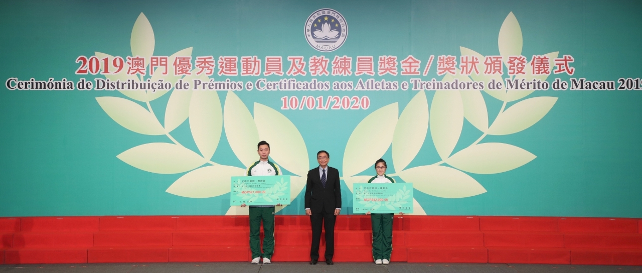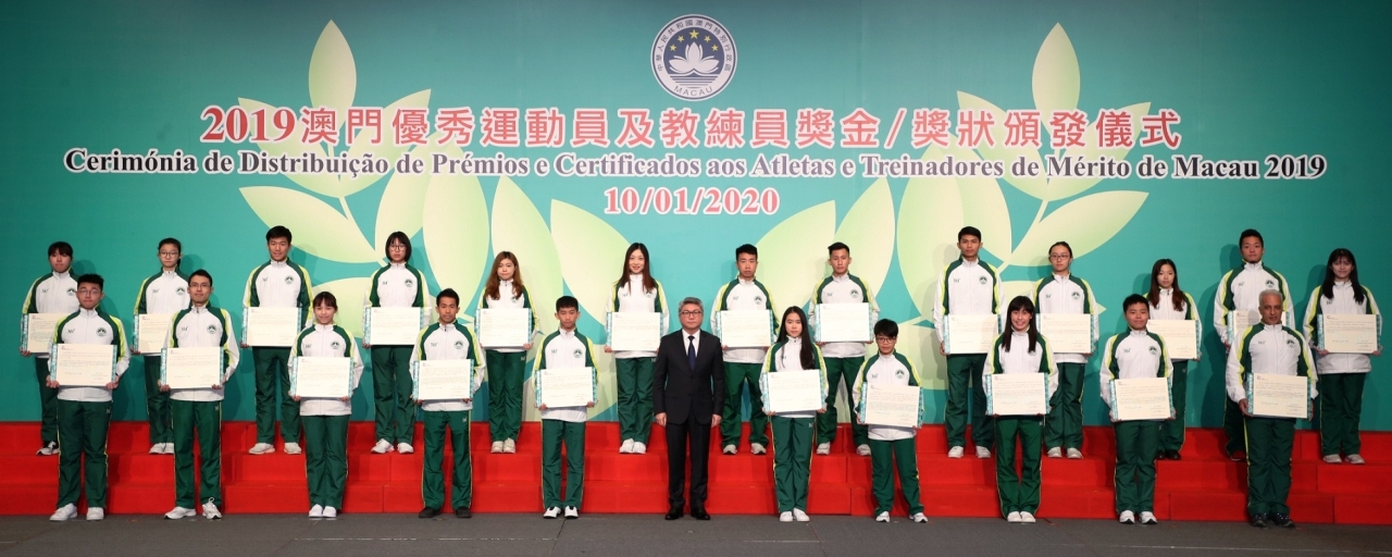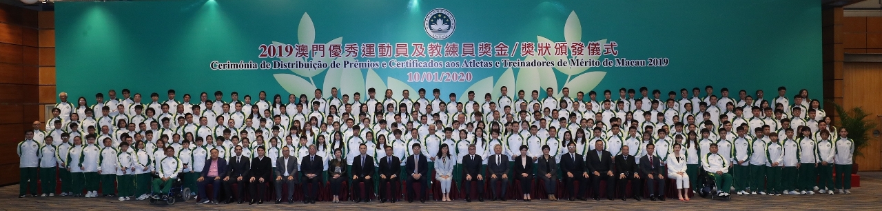 A “Cerimónia de Distribuição de Prémios e Certificados de Mérito Desportivo a Atletas e Treinadores de Macau 2019” presidida pela Secretária para os Assuntos Sociais e Cultura Ao Ieong U, presente em nome pessoal e em representação do Chefe do Executivo, realizou-se hoje (dia 10), pelas 19:30, no Centro de Convenções e Entretenimento da Torre de Macau 4.º andar, por forma a louvar os atletas, treinadores e equipas técnicas de apoio que obtiveram excelentes resultados desportivos nos eventos desportivos de 2019.