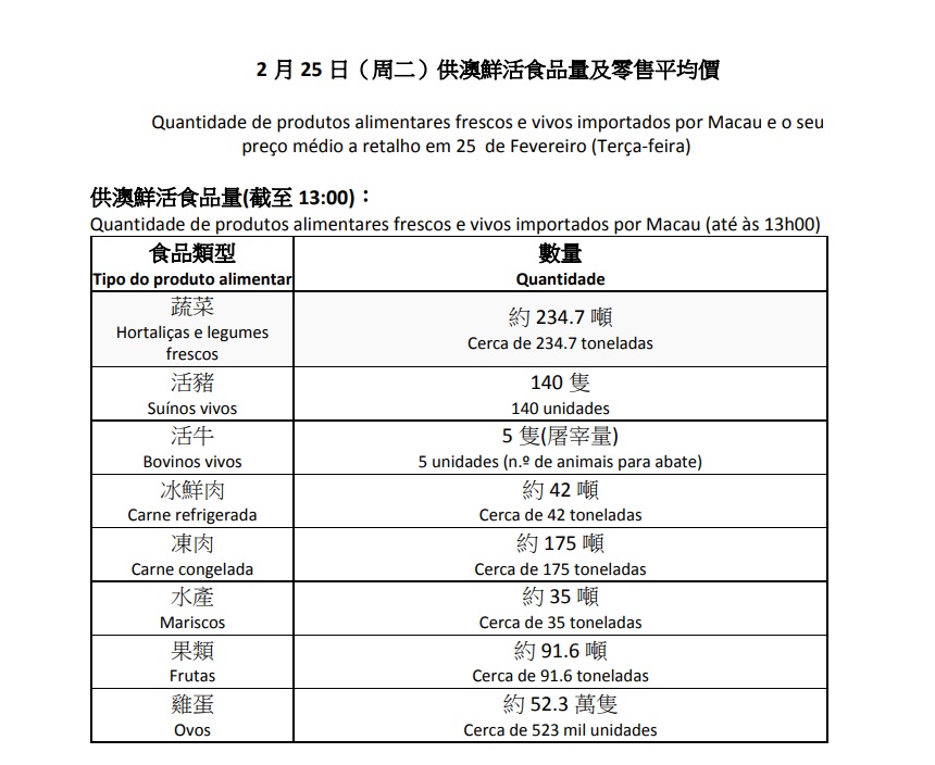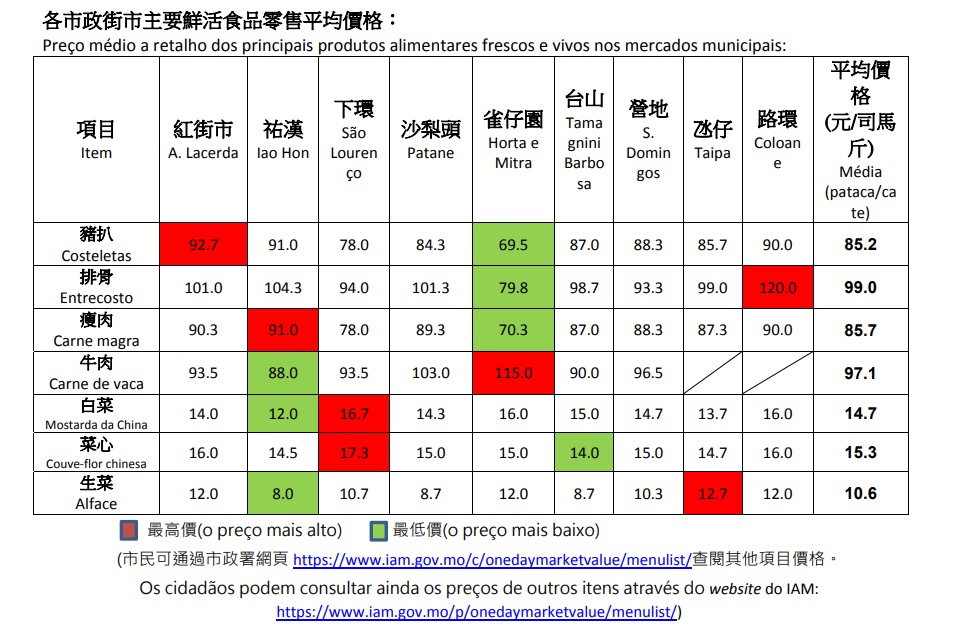 (Os cidadãos podem consultar ainda os preços de outros itens através do website do IAM: https://www.iam.gov.mo/p/onedaymarketvalue/menulist/)
