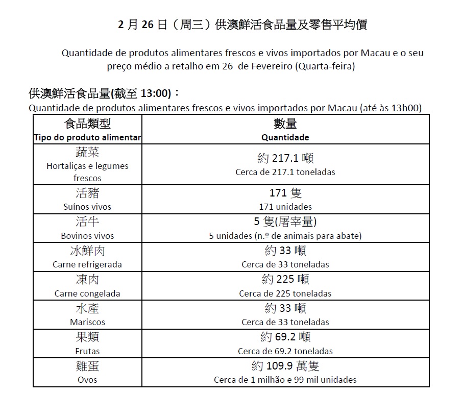 Quantidade de produtos alimentares frescos e vivos importados por Macau (até às 13h00)