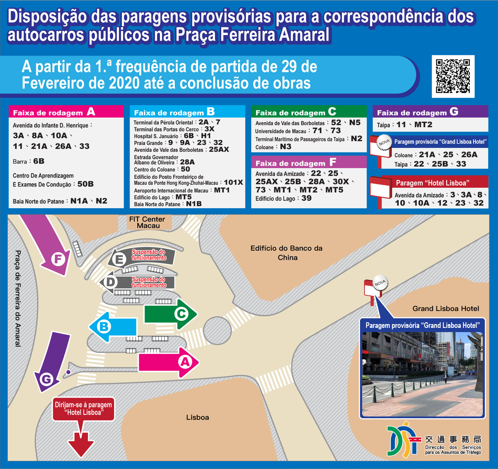 A DSAT apela a que todos os passageiros prestem atenção às indicações in loco. Serão destacados agentes da polícia do Departamento do Trânsito do CPSP, assistentes de trânsito da DSAT e os funcionários das operadoras de autocarros para manter a ordem e orientar os passageiros. Para mais informações consulte na página electrónica da DSAT www.dsat.gov.mo.