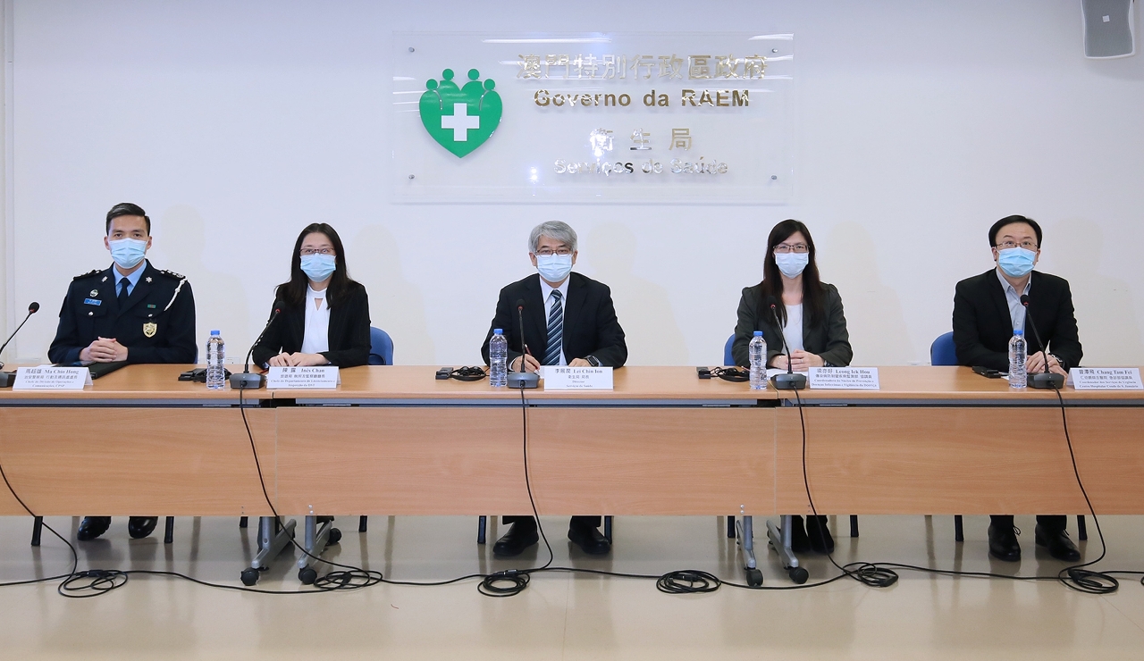 A conferência de imprensa contou com a presença do Director dos Serviços de Saúde, Lei Chin Ion, a Chefe do Departamento de Licenciamento e Inspecção da Direcção dos Serviços de Turismo, Dra. Chan Lou, o Chefe da Divisão de Operações e Comunicações do Corpo de Polícia de Segurança Pública, Dr. Ma Chio Hong, a Coordenadora do Núcleo de prevenção e doenças infecciosas e vigilância da doença do Centro de Prevenção e Controlo de Doenças dos Serviços de Saúde, Dra. Leong Iek Hou, o Coordenador do Serviço de Urgência do Centro Hospitalar Conde de São Januário, Dr. Chang Tam Fei.