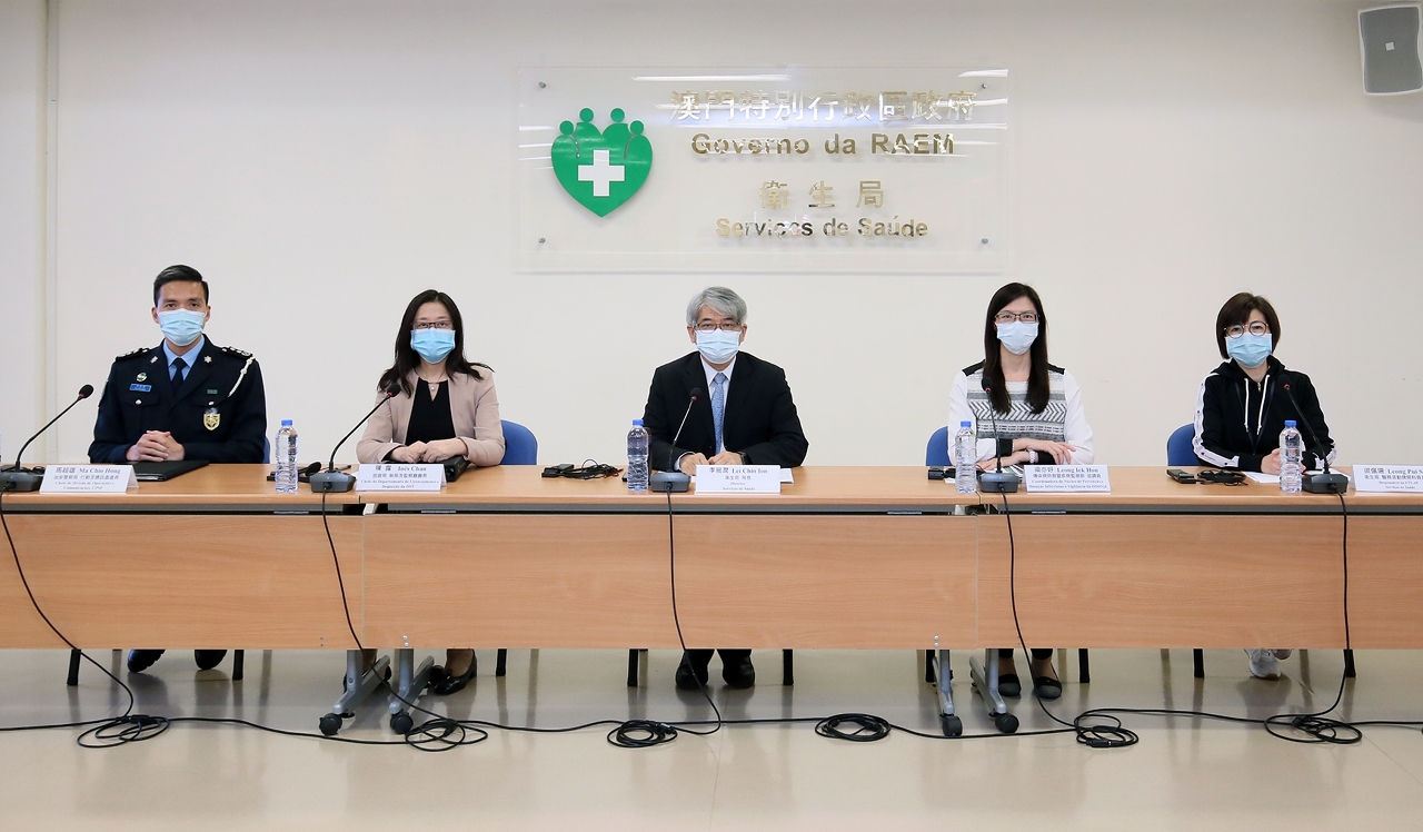 Estiveram presentes na conferência de imprensa do Centro de Coordenação de Contingência do Novo Tipo de Coronavírus: o Director dos Serviços de Saúde, Dr. Lei Chin Ion, a Chefe do Departamento de Licenciamento e Inspecção da Direcção dos Serviços de Turismo, Dr.ª Inês Chan, a Responsável da Unidade Técnica de Licenciamento das Actividades e Profissões Privadas de Prestação de Cuidados de Saúde, Dr.ª Leong Pui San, a Coordenadora do Centro de Prevenção e Controlo da Doença dos Serviços de Saúde, Dr.ª Leong Iek Hou, e o Chefe da Divisão de Operações e Comunicações do CPSP, Dr. Ma Chio Hong.