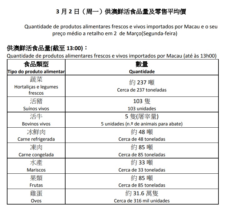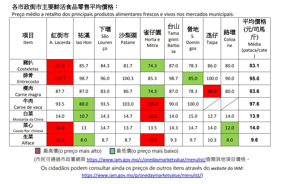 (Os cidadãos podem consultar ainda os preços de outros itens através do website do IAM: https://www.iam.gov.mo/p/onedaymarketvalue/menulist/)