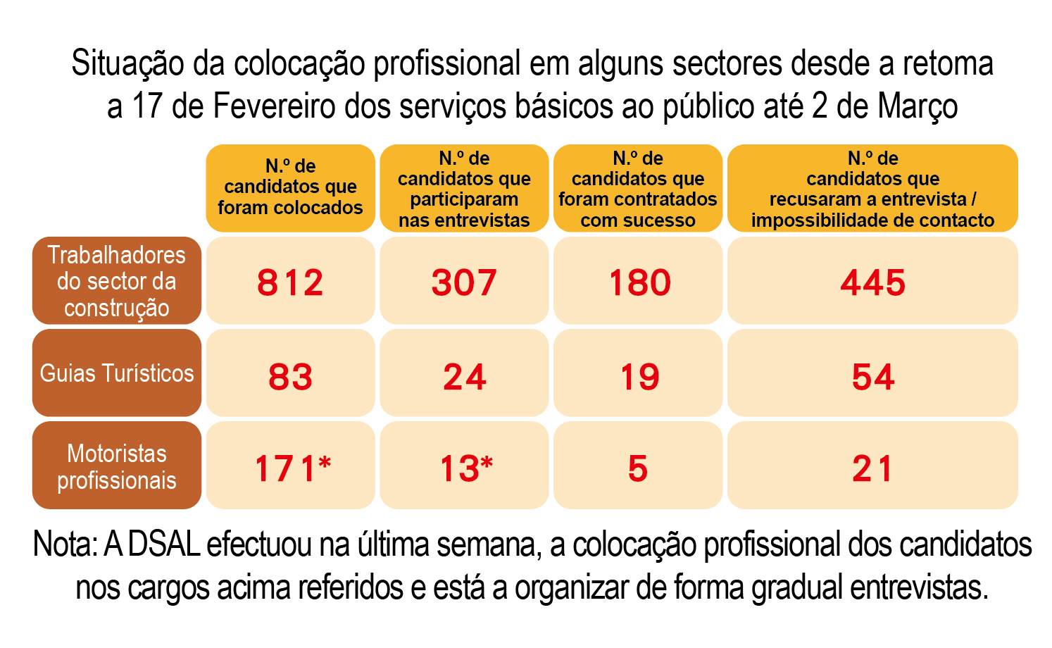Entre 17 de Fevereiro e 2 de Março, a DSAL prestou apoio contínuo aos trabalhadores da área da construção, guias turísticos e motoristas profissionais para a conjugação de emprego e colocação profissional, tendo enviado pessoal para fiscalizar in loco no decurso das entrevistas e dos testes de técnicas.