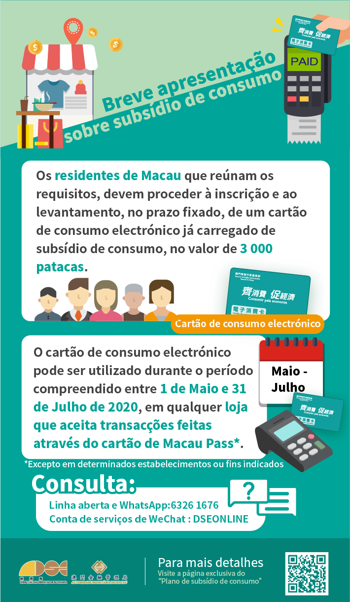 Sendo o “Plano de Subsídio de Consumo” como uma medida especial, o Governo da RAEM vai atribuir a cada residente qualificado um cartão de consumo electrónico com valor de 3.000 patacas, com o objectivo de dinamizar a economia de Macau, estimular a procura interna, apoiar as empresas na continuação dos negócios e estabilizar o mercado de emprego, de modo a alcançar a meta “Consumir pela economia, promover consumo interno e estabilidade laboral”.