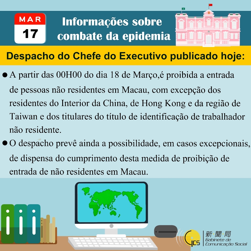 Tendo em conta a contínua propagação da epidemia do Covid-19 em todo o mundo, para prevenir a importação de casos de infecção do exterior e proteger a saúde dos residentes de Macau, o Chefe do Executivo proferiu hoje um despacho a declarar a proibição, a partir das 00H00 do dia 18 de Março, de entrada em Macau a todas as pessoas não residentes, com exclusão de residentes da China.