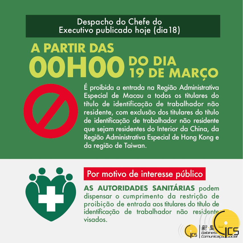 A partir das 00H00 do dia 19 de Março, é proibida a entrada na Região Administrativa Especial de Macau a todos os titulares do título de identificação de trabalhador não residente, com exclusão dos titulares do título de identificação de trabalhador não residente que sejam residentes do Interior da China, da Região Administrativa Especial de Hong Kong e da região de Taiwan.