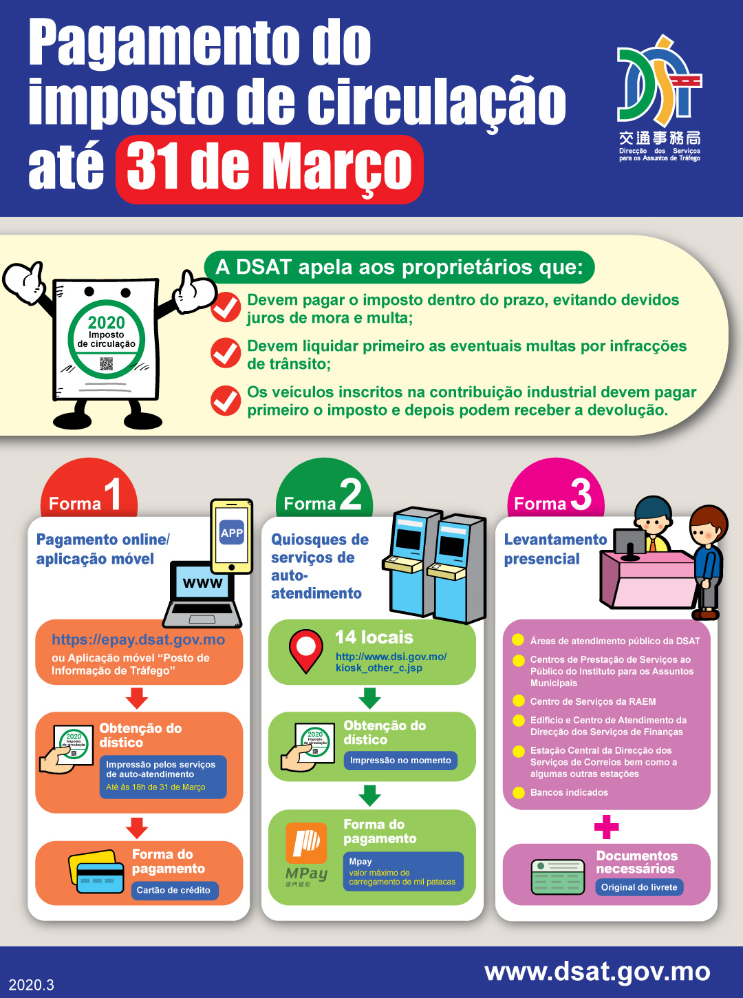 Em articulação com os trabalhos de prevenção epidémica e a fim de evitar a aglomeração de pessoas nas instalações, os proprietários de veículos podem pagar o imposto de circulação, através dos meios electrónicos, nomeadamente, na página electrónica https://epay.dsat.gov.mo e na aplicação móvel “Posto de Informação de Tráfego”, depois podendo efectuar a impressão do dístico nos quiosques de serviços de auto-atendimento. Por sua vez, os proprietários dos veículos podem, mediante o pagamento electrónico imediato “MPay”, obter o impresso do dístico nos quiosques de serviços de auto-atendimento instalados em 14 locais, alertando-se, contudo, para o facto de que o pagamento electrónico através do “MPay” tem o limite de mil patacas (valor máximo de carregamento). Para mais informações sobre os serviços de auto-atendimento, consulte a página da Direcção dos Serviços de Identificação (http://www.dsi.gov.mo/kiosk_other_p.jsp).