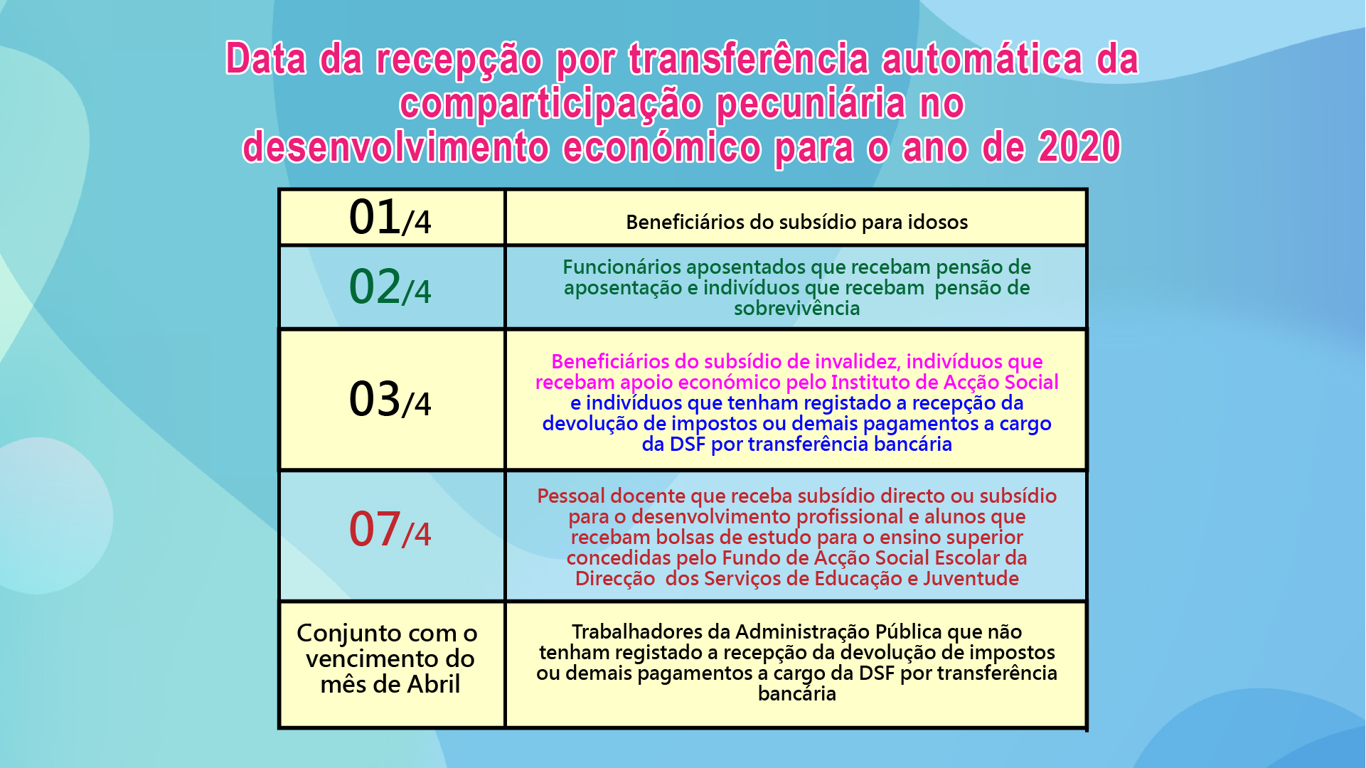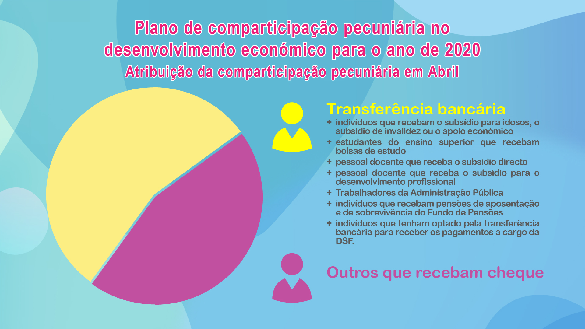 Atribuiu-se, hoje dia 1 de Abril, o montante do Plano, podendo os residentes permanentes e os residentes não permanentes de Macau receber 10 000 patacas e 6 000 patacas, respectivamente. A população pode visualizar/ consultar as informações mais actualizadas relativas ao Plano, através dos seguintes meios: