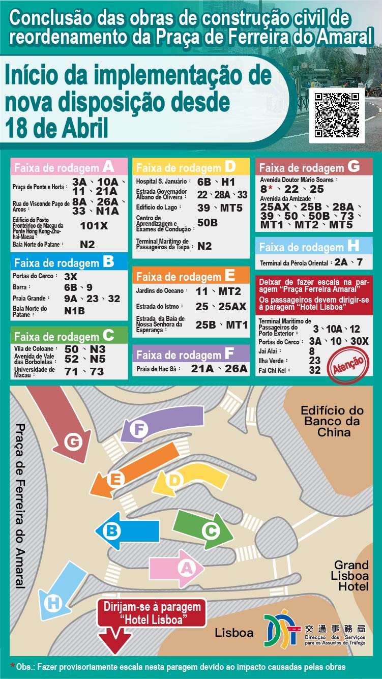 Tendo em conta a conclusão da primeira fase das obras de construção civil de reordenamento da Praça de Ferreira do Amaral, a Direcção dos Serviços para os Assuntos de Tráfego (DSAT) dispõe novamente a localização de fazer escala das carreiras a partir de primeira partida da carreira diurna do dia 18 de Abril (sábado), ao mesmo tempo, as carreiras que fazem escala nas paragens “Praça Ferreira Amaral” e “Hotel Lisboa” irão fazer apenas escala numa destas paragens. Para mais informações, vide as tabelas em anexo. Mais ainda, a partir do mesmo dia, a área de serviço da carreira n.º 39 irá ser expandida até ao NAPE, o seu terminal será ajustado para paragem “NAPE/RUA DE COIMBRA”.