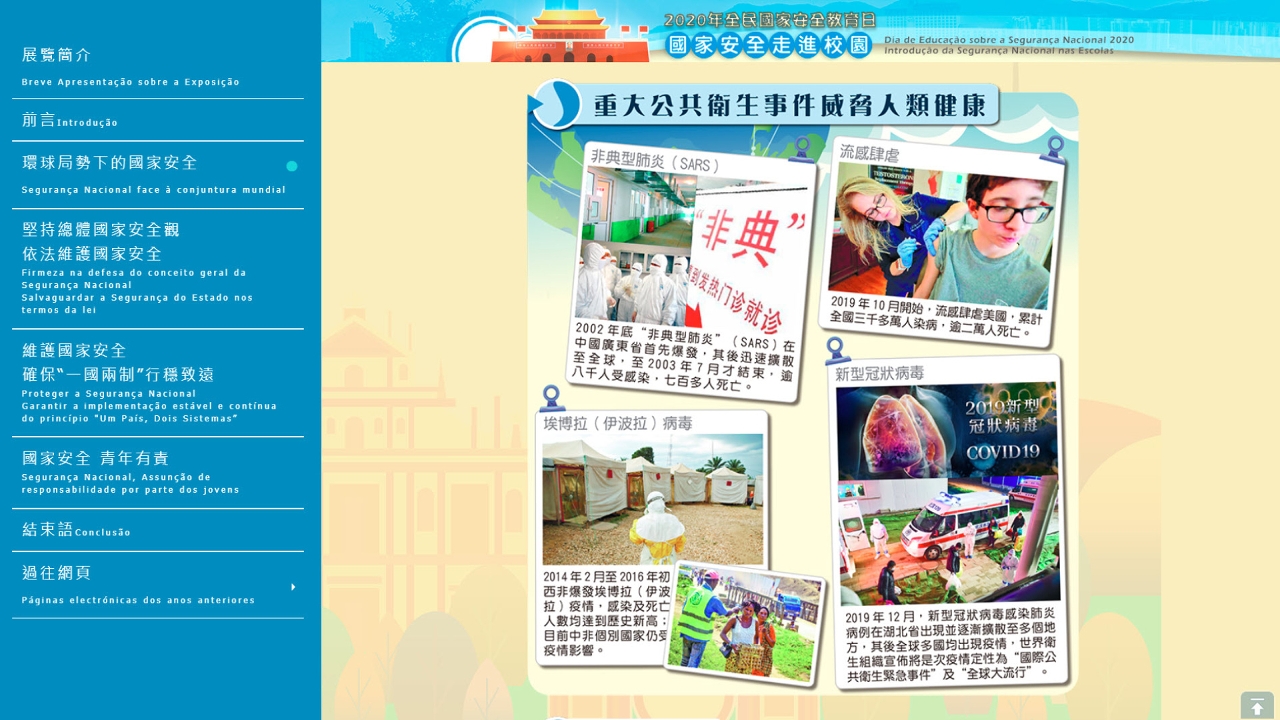 A fim de alargar o conhecimento sobre a segurança de Estado, de grande significado e importância para a população, o governo da Região Administrativa Especial de Macau (RAEM), com o apoio do Gabinete de Ligação do Governo Central na RAEM, organizou uma exposição virtual de fotografias subordinada ao tema “Introdução da Segurança Nacional nas Escolas”, cujo intuito é apresentar o trabalho desenvolvido por Macau.