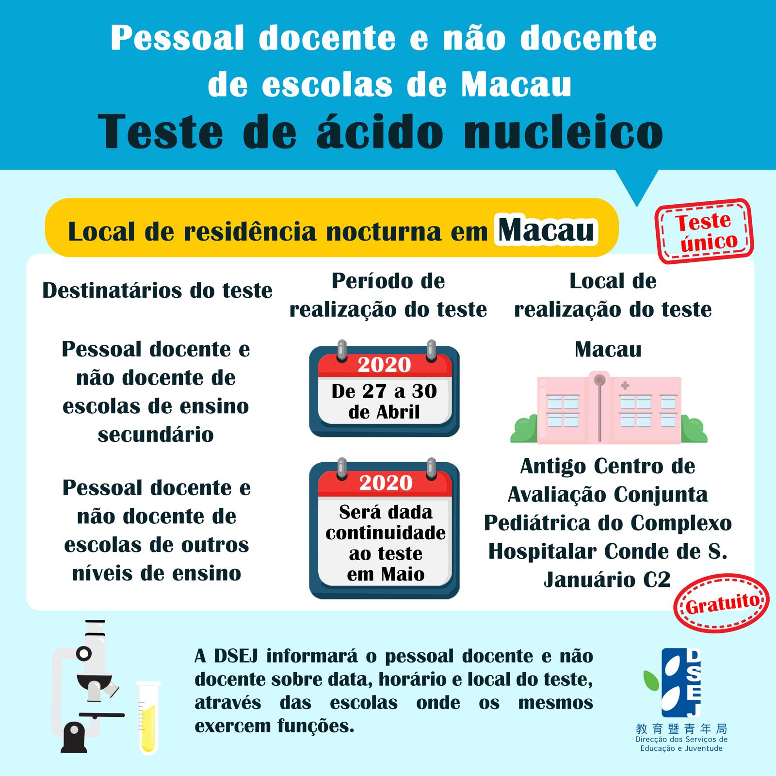 O pessoal docente e não docente das escolas do ensino não superior será testado, uma única vez, nas antigas instalações do Centro de Avaliação Conjunta Pediátrica do Hospital Conde de S. Januário. O pessoal docente e não docente, a residir fora de Macau, bem como os alunos transfronteiriços, serão testados em Zhuhai. O plano será realizado por etapas. O pessoal, docente e não docente, que exerce funções em escolas de ensino secundário, será o primeiro a ser testado, entre 27 e 30 de Abril, para assegurar um reinício, sem sobressaltos, das aulas presenciais dos ensinos secundário complementar e secundário geral. Os testes a realizar ao pessoal docente e não docente de outros níveis de ensino serão efectuados seguidamente, em conformidade com as disposições emitidas de reinício das actividades lectivas nas escolas.