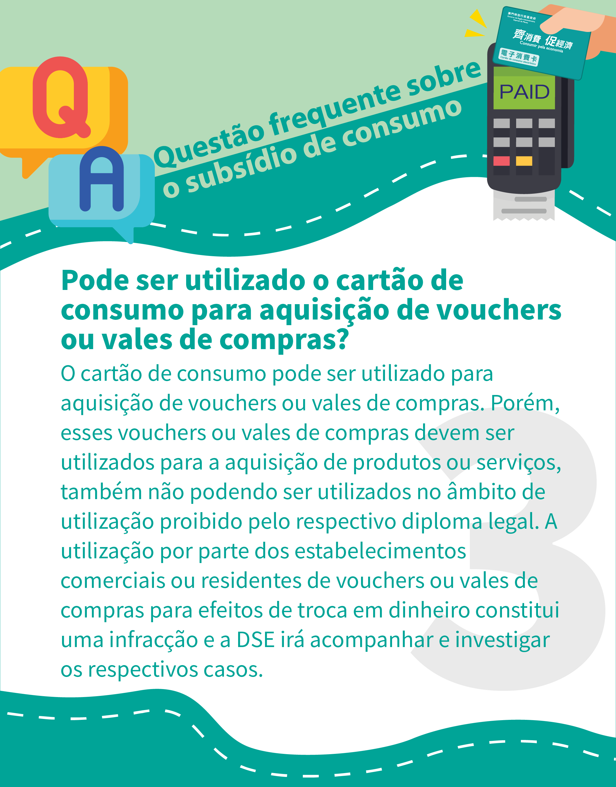 O cartão de consumo pode ser utilizado para aquisição de vouchers ou vales de compras. Porém, esses vouchers ou vales de compras devem ser utilizados para a aquisição de produtos ou serviços, também não podendo ser utilizados no âmbito de utilização proibido pelo respectivo diploma legal. A utilização por parte dos estabelecimentos comerciais ou residentes de vouchers ou vales de compras para efeitos de troca em dinheiro constitui uma infracção e a DSE irá acompanhar e investigar os respectivos casos.