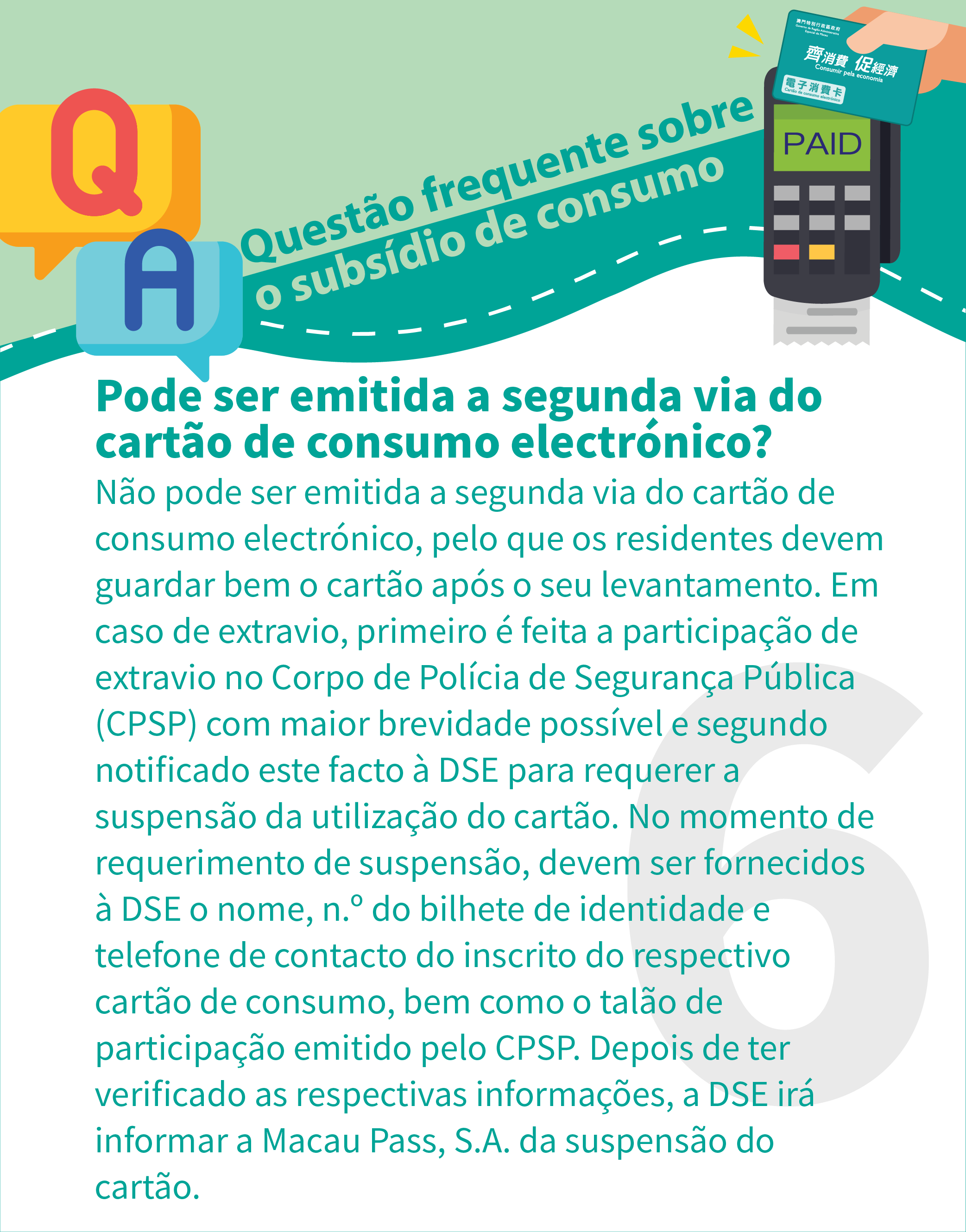 Não pode ser emitida a segunda via do cartão de consumo electrónico, pelo que os residentes devem guardar bem o cartão após o seu levantamento. Em caso de extravio, primeiro é feita a participação de extravio no Corpo de Polícia de Segurança Pública (CPSP) com maior brevidade possível e segundo notificado este facto à DSE para requerer a suspensão da utilização do cartão. No momento de requerimento de suspensão, devem ser fornecidos à DSE o nome, n.º do bilhete de identidade e telefone de contacto do inscrito do respectivo cartão de consumo, bem como o talão de participação emitido pelo CPSP. Depois de ter verificado as respectivas informações, a DSE irá informar a Macau Pass, S.A. da suspensão do cartão.