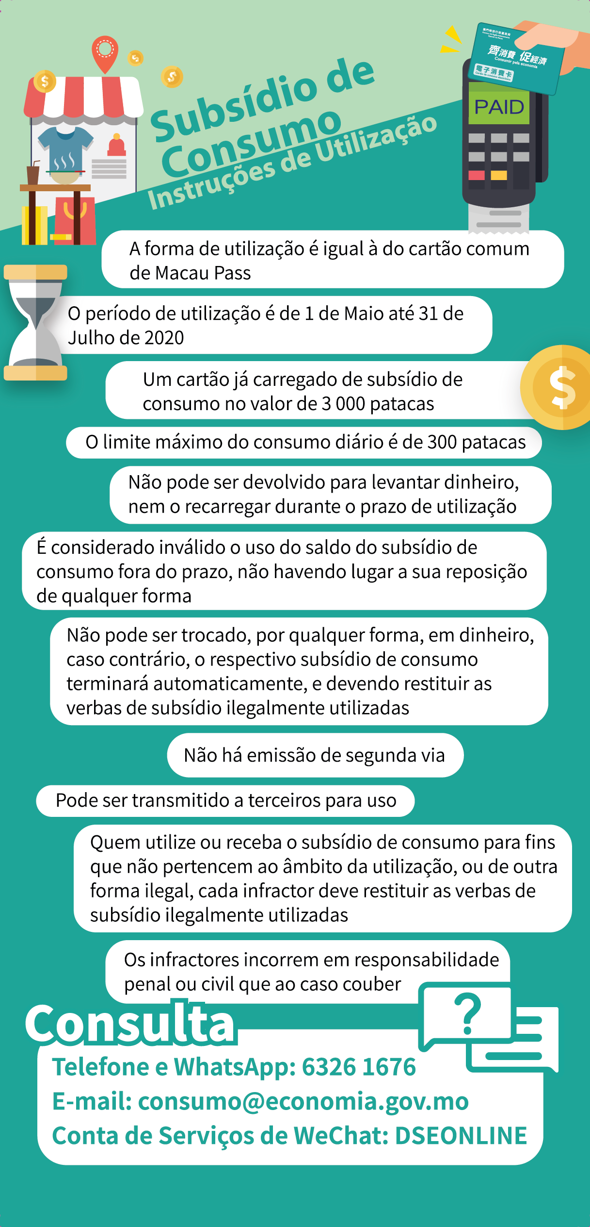 O cartão de consumo, cuja utilização tem um limite máximo diário de 300 patacas, não pode ser trocado em dinheiro, nem podendo ser utilizado para pagar as despesas com água, electricidade, gás natural, combustíveis, serviços de telecomunicações e serviços de radiodifusão televisiva e sonora, também não podendo ser utilizado em determinados estabelecimentos e determinadas finalidades legalmente previstas, como casinos, serviços turísticos no exterior, serviços de transporte transfronteiriço, serviços médicos e instituições financeiras.