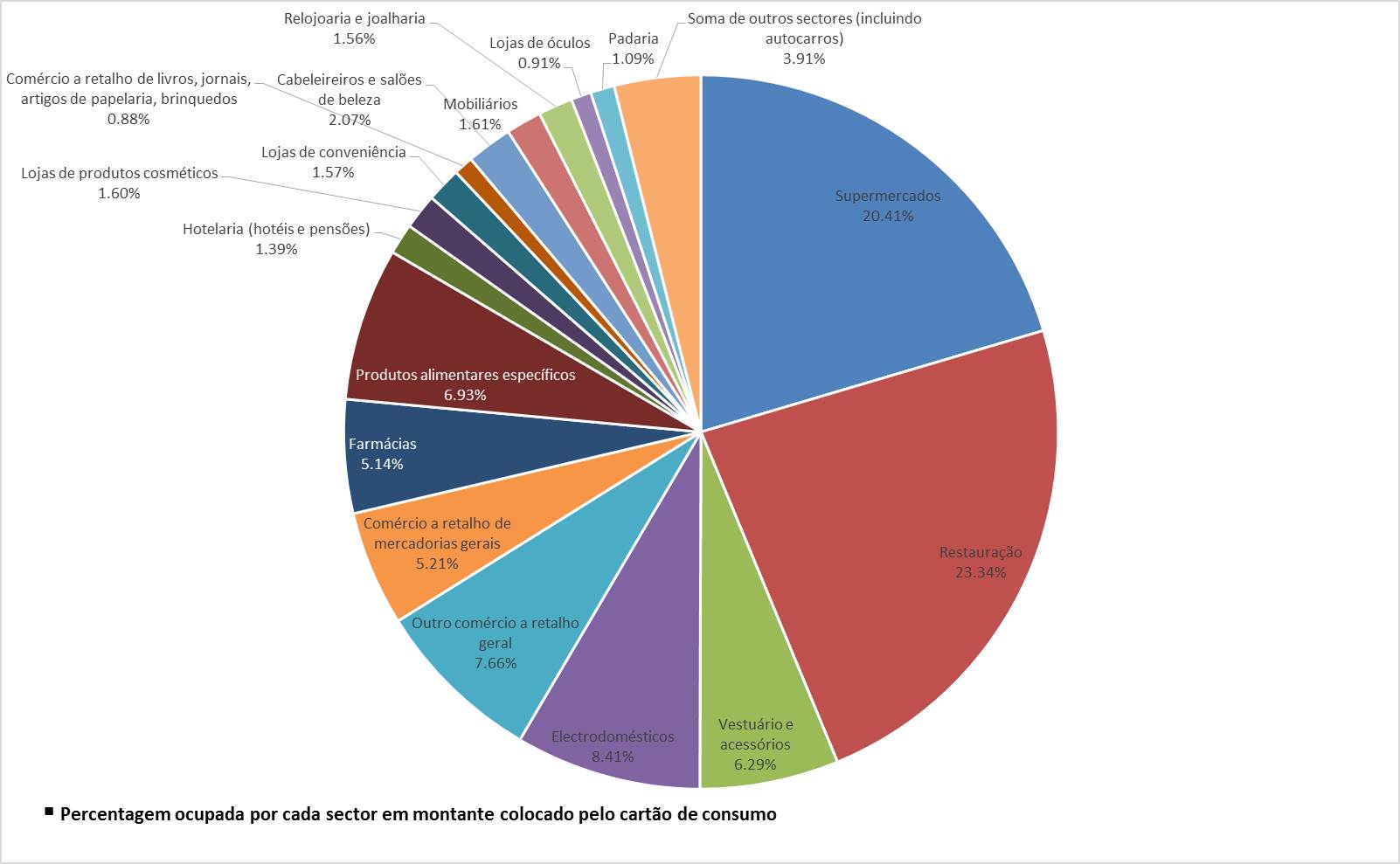 Quando ordenados conforme o montante das transacções, desde o dia 1 a 10 de Maio, os primeiros cinco sectores são restauração, supermercados, electrodomésticos, outro comércio a retalho geral e produtos alimentares específicos, representando, respectivamente, 23,34%, 20,41%, 8,41%, 7,66% e 6,93%.
