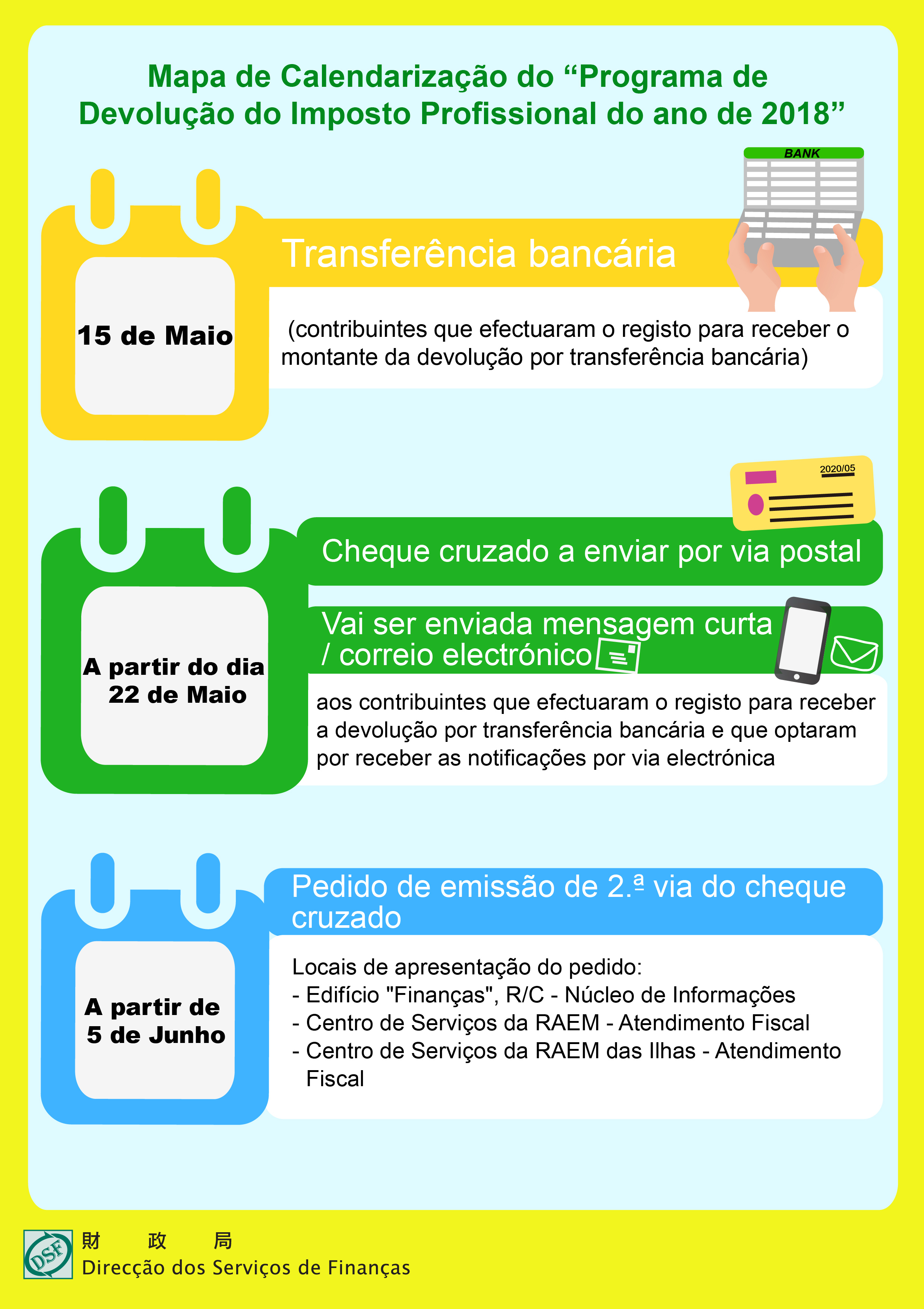 Caso os contribuintes do imposto profissional, que sejam beneficiários, tenham procedido ao registo de recebimento da devolução do imposto por transferência bancária, vão receber os respectivos montantes no dia 15 de Maio, sendo os restantes a ser atribuídos, sucessivamente, através de cheque cruzado, a partir do dia 22 de Maio.