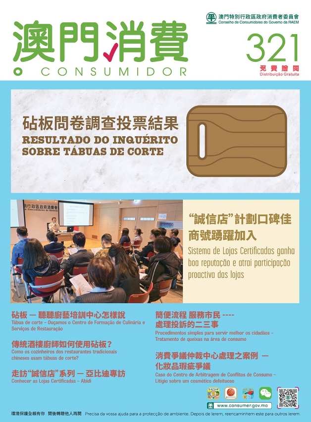 Os cidadãos interessados agora podem visualisar a revista “O Consumidor” n.º 321 na página electrónica do CC (www.consumer.gov.mo) e na sua conta de WeChat, bem como obter a revista em suporte de papel na sede do CC, sita no Edifício Clementina Ho, Av. Horta e Costa n.º 26, no posto de atendimento ao público do CC situado na Rua Nova da Areia Preta, Centro de Serviços da RAEM, 1.º andar, Zona M, no Centro de Informações ao Público situado na Rua do Campo, Vicky Plaza, nas bibliotecas que funcionam sob a tutela do Instituto Cultural, na Sala de Leitura da Associação Comercial de Macau ("Biblioteca Octogonal") e na Plaza Cultural Macau.