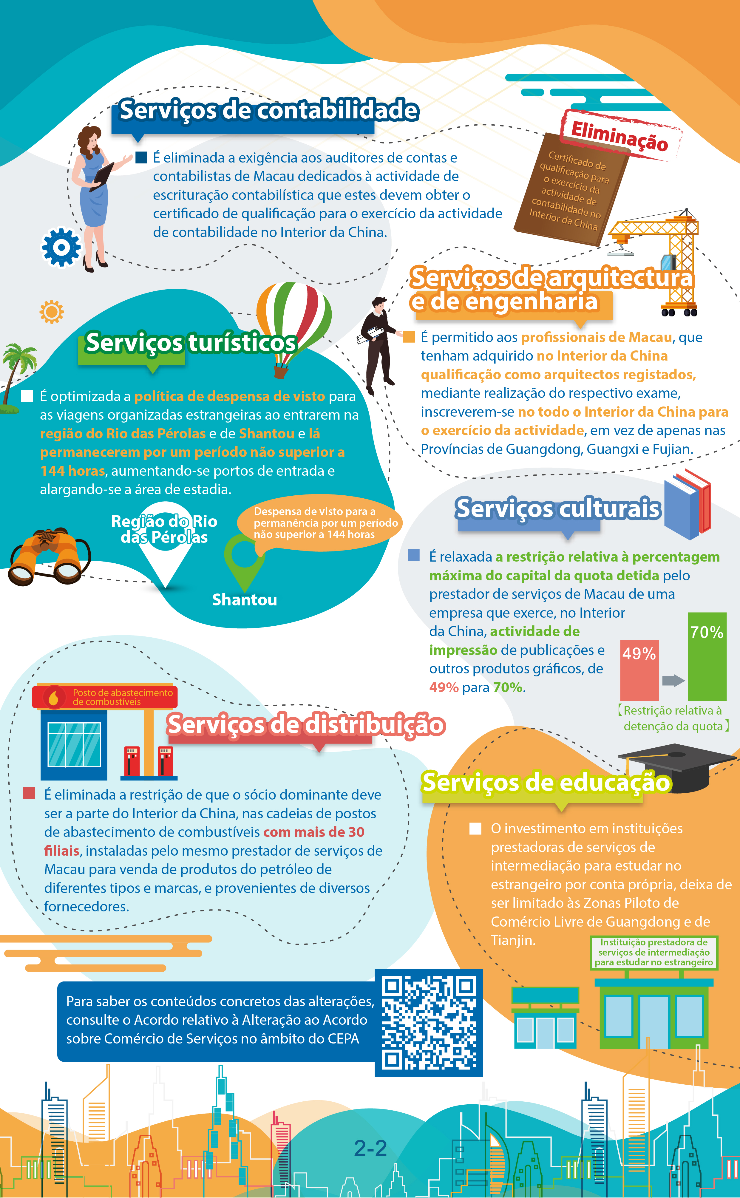 Ao mesmo tempo, o número dos sectores de serviços de Macau aos quais o Interior da China concede o tratamento nacional sem reservas é aumentado de 62 para 69, incluindo os sectores de contabilidade, construção e design, engenharia, reparação e manutenção de equipamentos, venda por grosso, transporte ferroviário e agenciamento de carga, entre outros. Os prestadores de serviços de Macau podem assim ter acesso ao mercado do Interior da China, gozando das mesmas condições de acesso dos investidores do Interior da China, criando, deste modo, um ambiente favorável para as empresas de Macau a explorarem o enorme mercado do Interior da China.