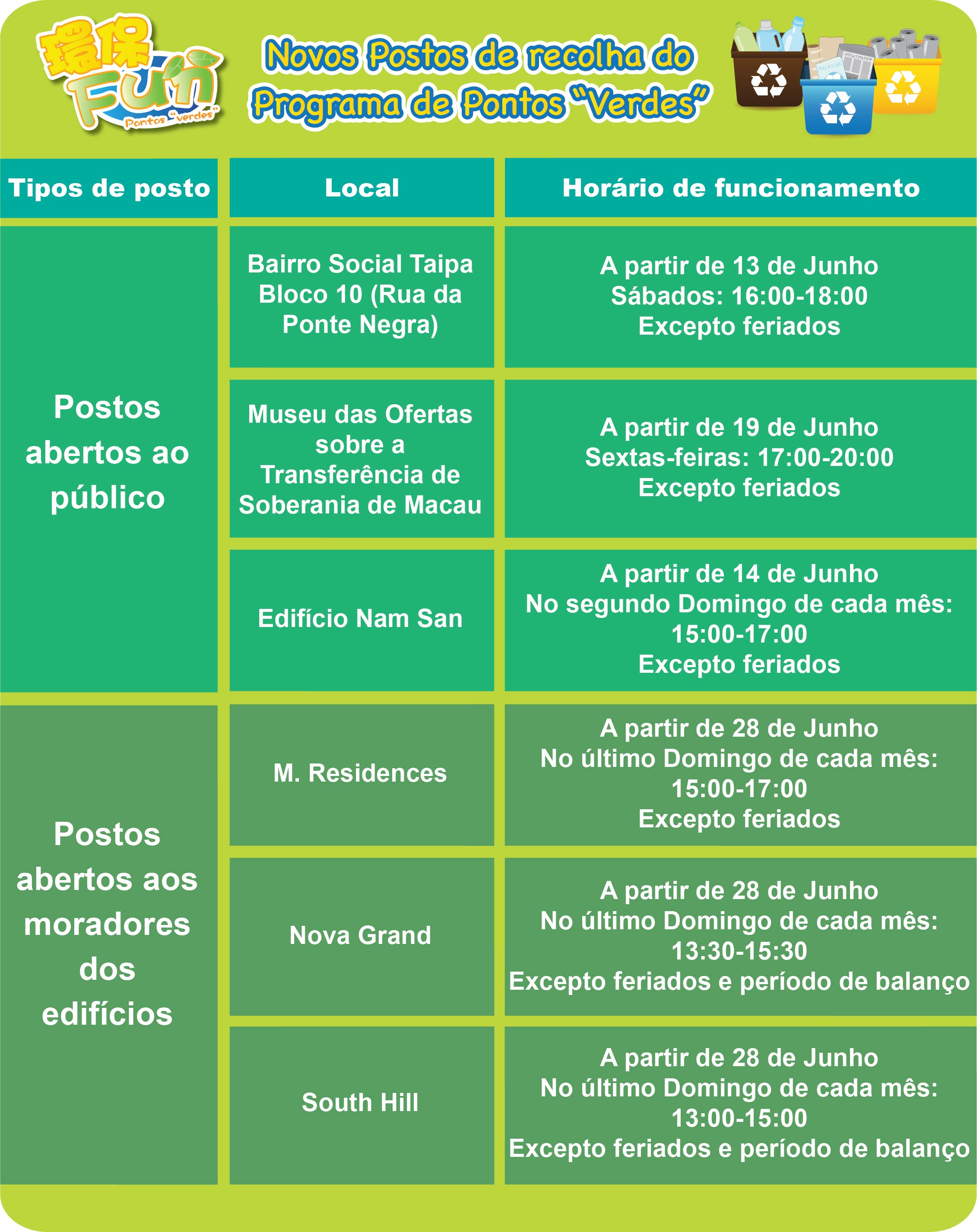 Este ano, a Direcção dos Serviços de Protecção Ambiental (DSPA) irá reforçar a promoção e a prática da recolha selectiva de materiais recicláveis através da rede comunitária. Para além do lançamento do plano “Efectuar a recolha selectiva nos edifícios é muito fácil” e da instalação de mais postos de recolha em colaboração com a Caritas de Macau, entre outros, a partir de meados de Junho, iniciar-se-á a instalação progressiva dos postos de reciclagem limpa no âmbito do Programa de Pontos “Verdes” no Museu das Ofertas sobre a Transferência de Soberania de Macau, assim como em diversos edifícios residenciais, nomeadamente no Bairro Social Taipa, Bloco 10 (Rua da Ponte Negra), no Edifício Nam San, no M. Residences, no Nova Grand e no South Hill (para mais pormenores é favor consultar a tabela anexa).