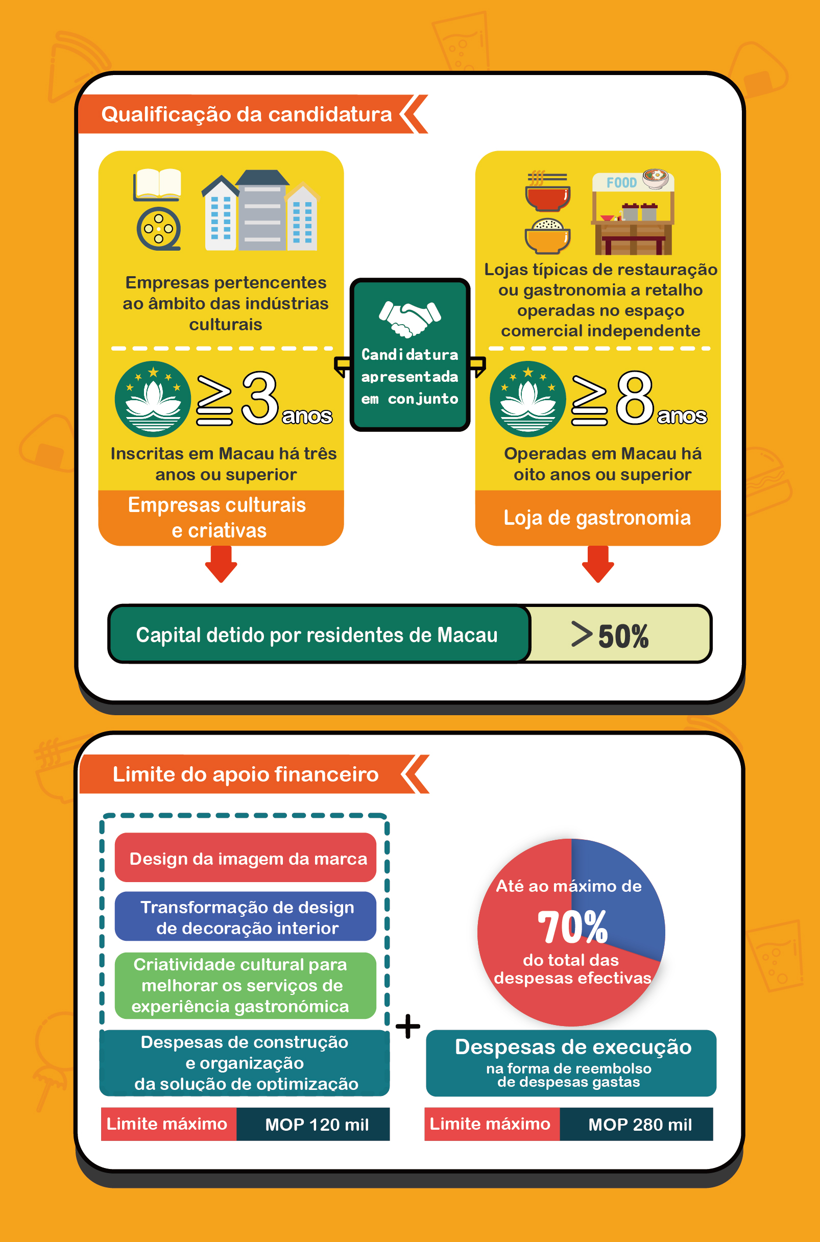A candidatura deve ser apresentada conjuntamente pela empresa cultural e criativa e pela loja gastronómica comunitária. Os requisitos de candidatura ao Programa incluem as empresas culturais e criativas a serem constituídas em Macau pelo menos 3 anos, e as lojas gastronómicas comunitárias estarem em funcionamento por oito anos ou superior, com estabelecimentos comerciais independentes para a operação de restauração ou a venda do retalho alimentar. Além disso, o capital social das empresas e lojas acima referidas deve ser detido por residentes da RAEM por mais de 50% .