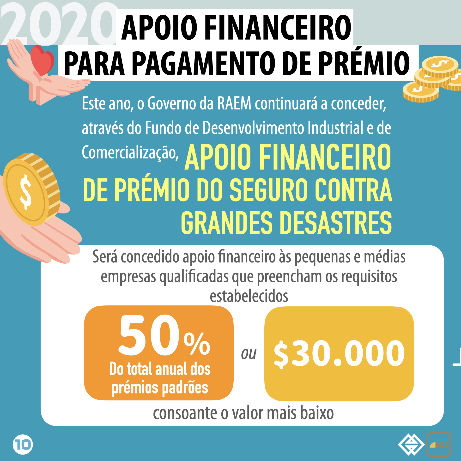 Além disso, o Governo da RAEM continuará a conceder, através do Fundo de Desenvolvimento Industrial e de Comercialização, o “Apoio financeiro de prémio do seguro contra grandes desastres” às pequenas e médias empresas qualificadas que preencham os requisitos estabelecidos, sendo que o valor do apoio financeiro equivale a 50% ou a 30 000 patacas do total anual do prémio padrão (consoante o valor mais baixo), com o intuito de aumentar o interesse das pequenas e médias empresas na aquisição de Seguro contra grandes desastres e reduzir o encargo financeiro das mesmas.