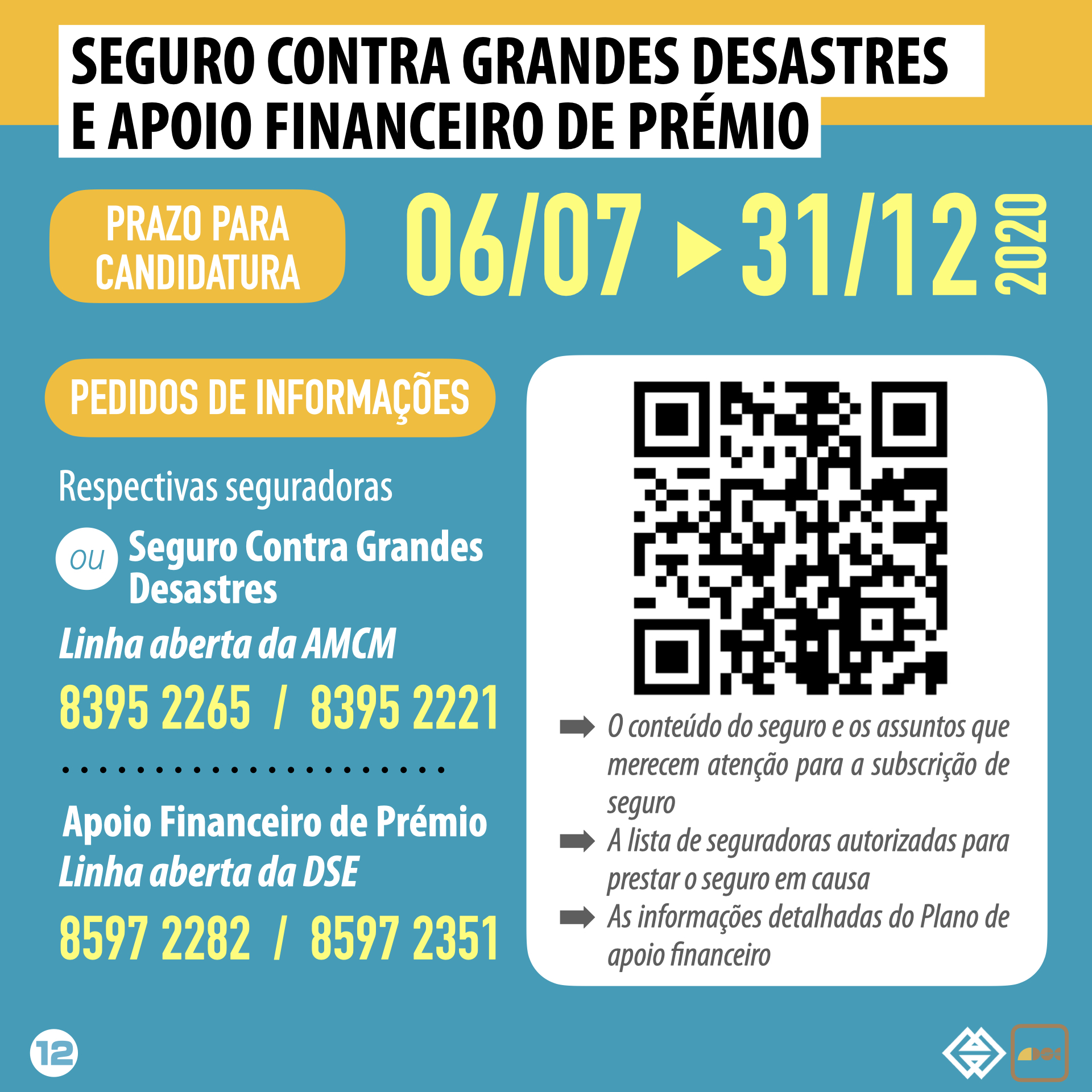 O conteúdo do Seguro contra grandes desastres para o ano 2020, a lista de seguradoras autorizadas para prestar o referido seguro e as informações detalhadas do Plano de apoio financeiro podem ser consultados na página electrónica da AMCM (https://www.amcm.gov.mo/zh/typhoon-information/swe). Para esclarecimento de quaisquer dúvidas sobre o Seguro contra grandes desastres, por favor contactem directamente com as respectivas seguradoras, ou com a linha aberta do Seguro contra grandes desastres da Autoridade Monetária de Macau (número de telefone: 8395 2265/8395 2221 durante o horário de expediente). Para prestação de informações sobre o Plano de apoio financeiro, por favor contactem com a linha aberta da Direcção dos Serviços de Economia (número de telefone: 8597 2282).
