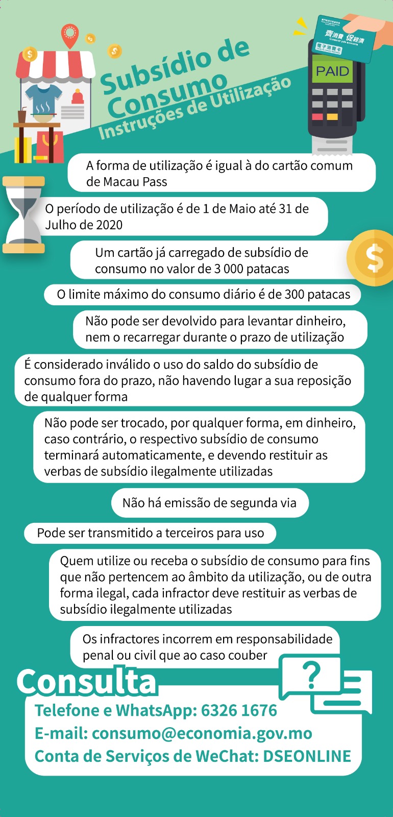 O Governo da RAEM apela aos residentes inscritos que ainda não tenham levantado o cartão de consumo da 1.ª fase para o levantarem com a maior rapidez possível, e aos aqueles que já o levantaram para o utilizarem o mais cedo possível. Findo o prazo de utilização deste cartão de consumo em 31 de Julho, o saldo remanescente não utilizado no prazo fixado será reposto no cofre do Tesouro.