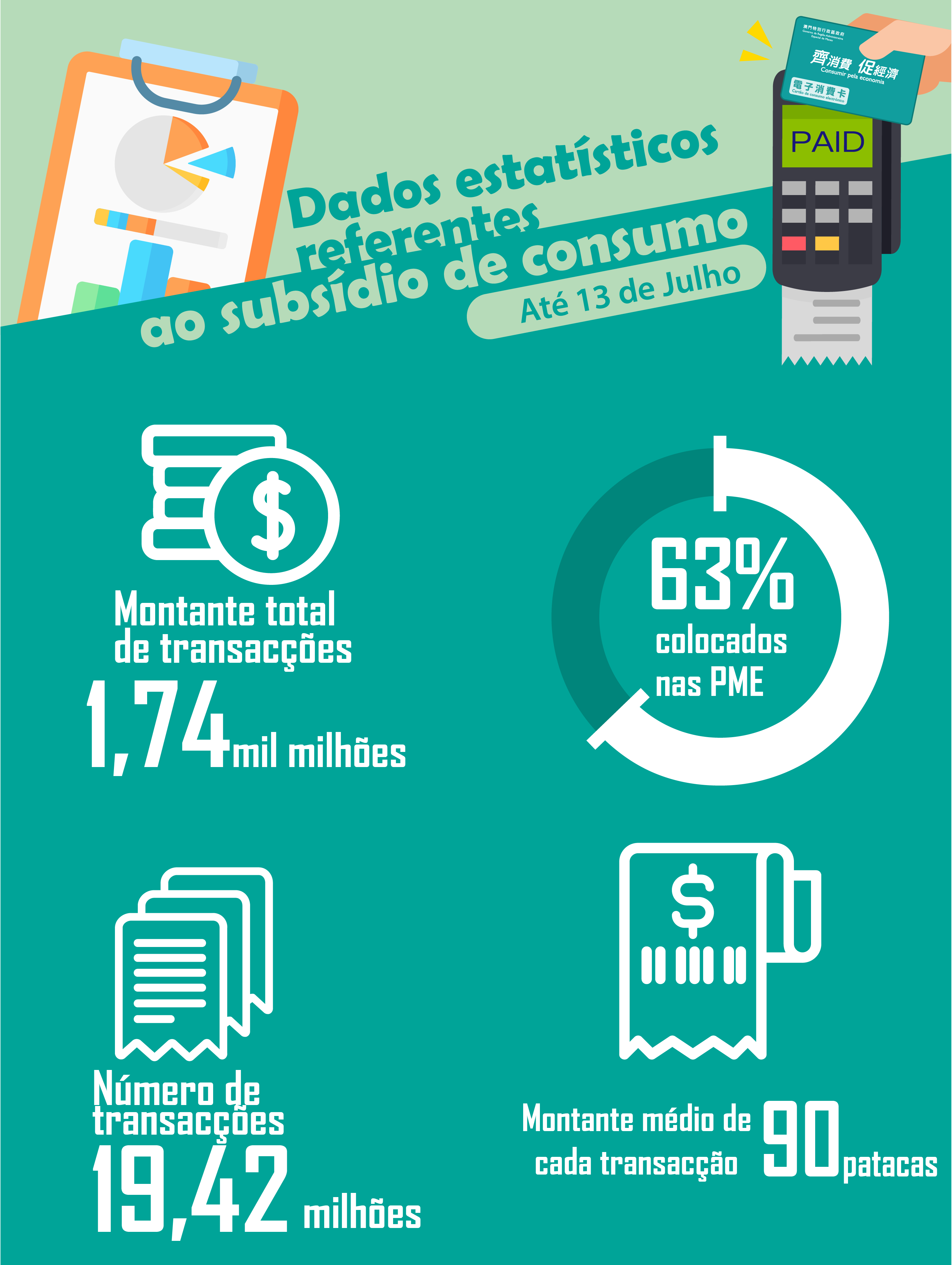 Com vista a dinamizar a economia, alargar a procura interna, mitigar as dificuldades enfrentadas pelas empresas na exploração de negócios, estabilizar o mercado de emprego e, ao mesmo tempo, atenuar a pressão económica dos residentes, o Governo da RAEM lançou o cartão de consumo electrónico num valor total de 8.000 patacas, distribuídas em duas fases. Desde o início da utilização da 1.ª fase do cartão de consumo, em 1 de Maio, até 13 de Julho, o montante total de transacções fixou-se em cerca de 1,74 mil milhões de patacas, representando mais de 90% do montante total dos cartões de consumo emitidos, tendo sido registadas cerca de 19,42 milhões de transacções. O montante médio de cada transacção é de 90 patacas.