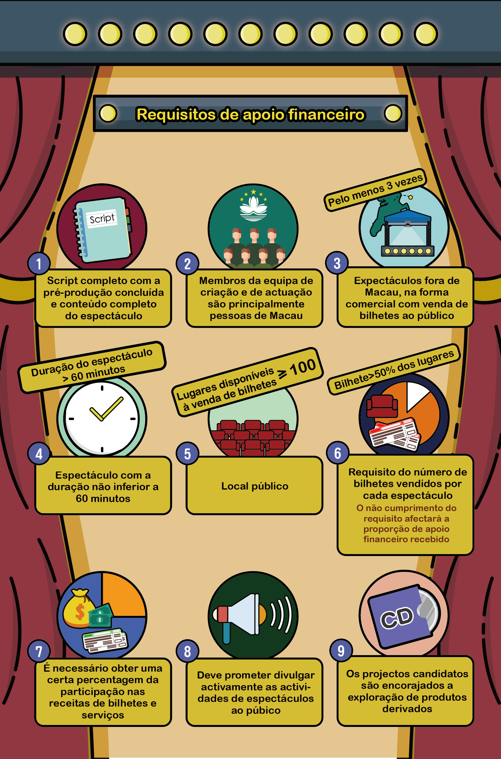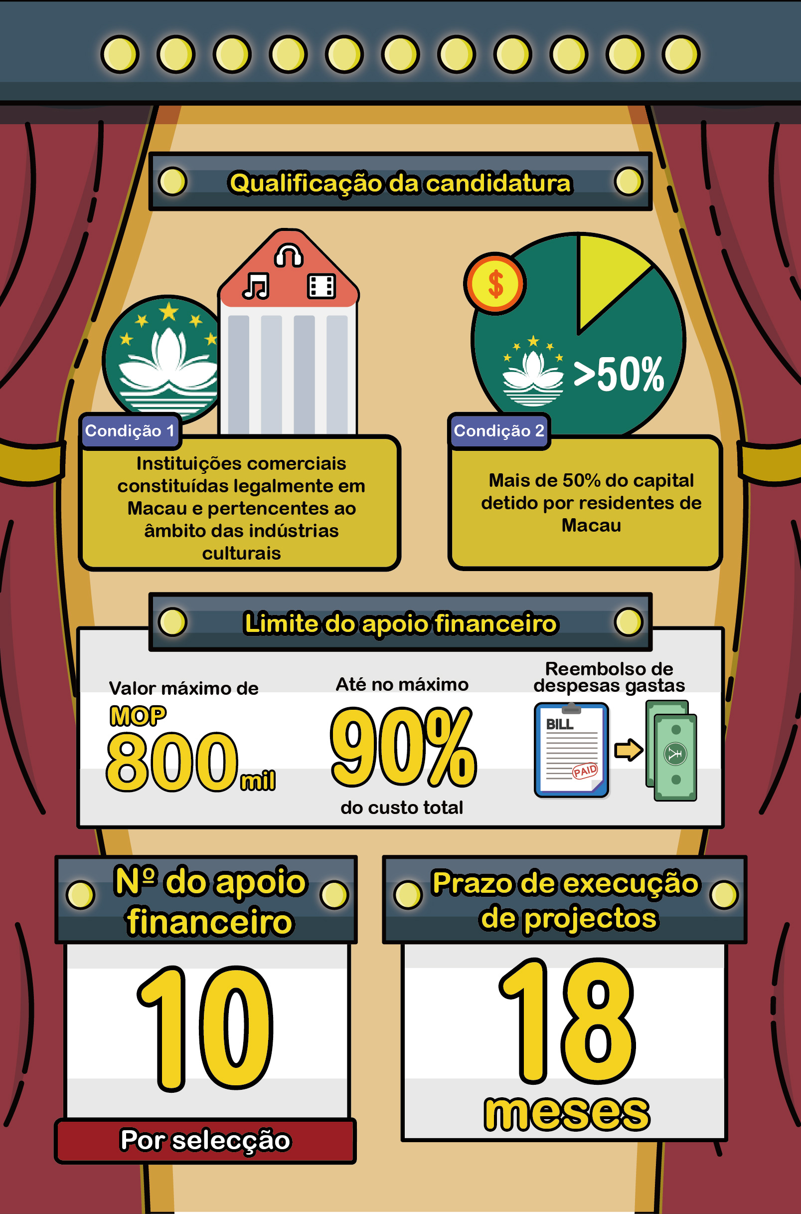 O FIC irá admitir os projectos candidatos por forma de selecção, no total de 10 projectos concedidos, com o período de execução do projecto de 18 meses. O limite de apoio financeiro é de 90% do custo total do projecto, sendo o limite máximo de MOP800 mil. Os âmbitos para a utilização das verbas de apoio financeiro incluem: despesas em recursos humanos (criadores, actores e técnicos); renda do espaço para a realização de exposições e espectáculos; despesas de cenografia, adereços e vestidos, equipamentos de iluminações e de sonares, construção e desmontagem de palco; despesas de divulgação e promoção; despesas de transporte dos actores e dos trabalhadores (especificação designada); despesas de produção de produtos derivados; despesas de logística e de auditoria/contabilidade. O FIC irá prestar apoio financeiro na forma de pagamento de despesas efectivas, devendo as verbas de apoio financeiro ser geridas através de conta bancária específica fechada, sujeitando-se à auditoria de companhia auditora, no sentido de assegurar que o erário público seja eficientemente aplicado. As empresas interessadas podem descarregar o Boletim de Candidatura na página electrónica (www.fic.gov.mo). Para quaisquer dúvidas, queira consultar através do n.º de telefone 2850 1000 ou por e-mail (info@fic.gov.mo).