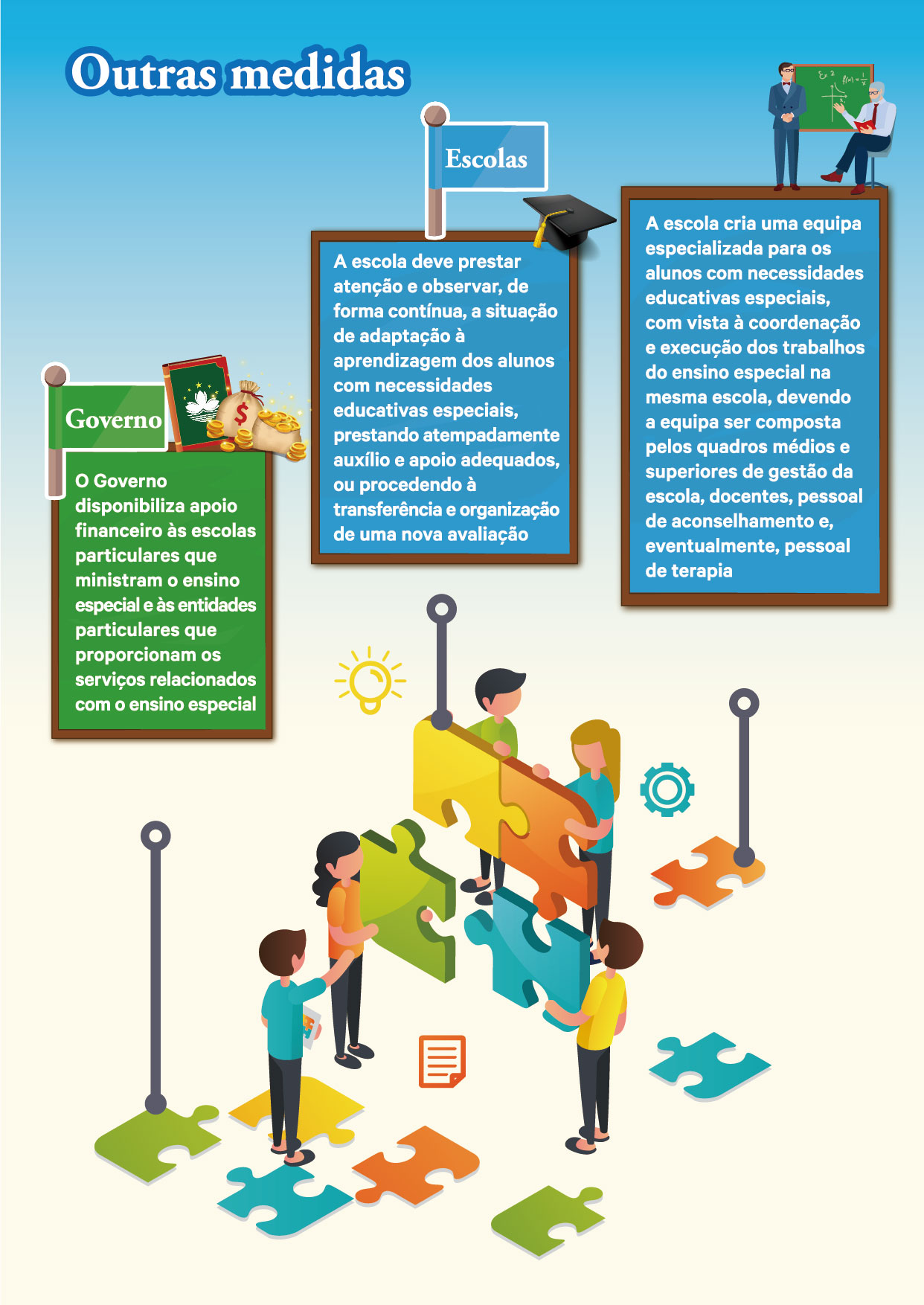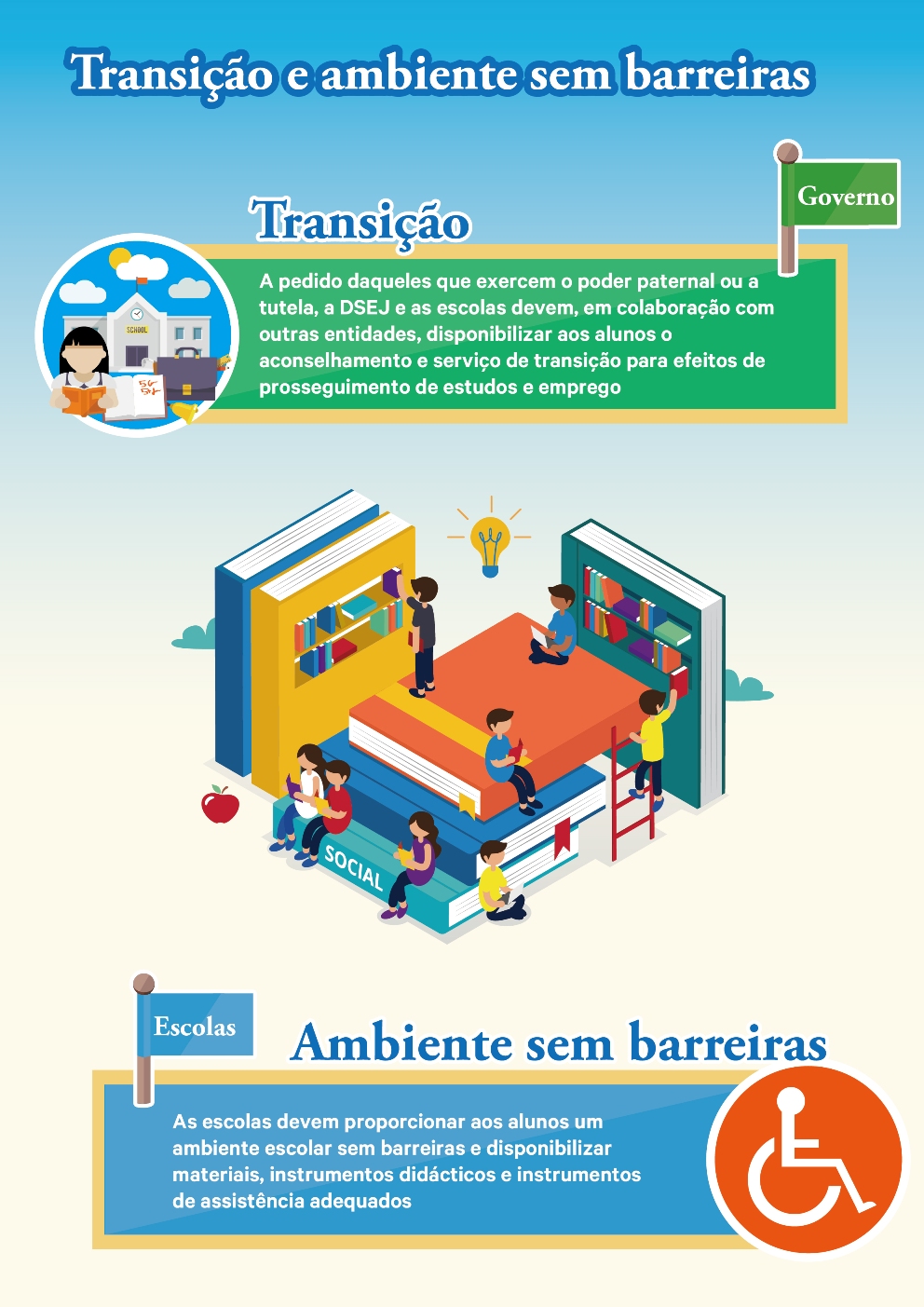 Por solicitação daqueles que exercem o poder paternal ou detêm a tutela do aluno, o Governo e as escolas devem, em colaboração com outras entidades públicas e particulares, disponibilizar, aos alunos, serviços de aconselhamento e de transição para efeitos de prosseguimento de estudos e emprego. Para que os alunos com limitações educativas especiais, tanto físicas como psicológicas, possam aprender com sucesso, as escolas devem proporcionar um ambiente escolar sem barreiras, disponibilizando materiais e instrumentos didácticos e de assistência adequados. O Governo disponibilizará apoio financeiro às escolas particulares que ministrarem o ensino especial e às entidades particulares que fornecerem serviços relacionados.