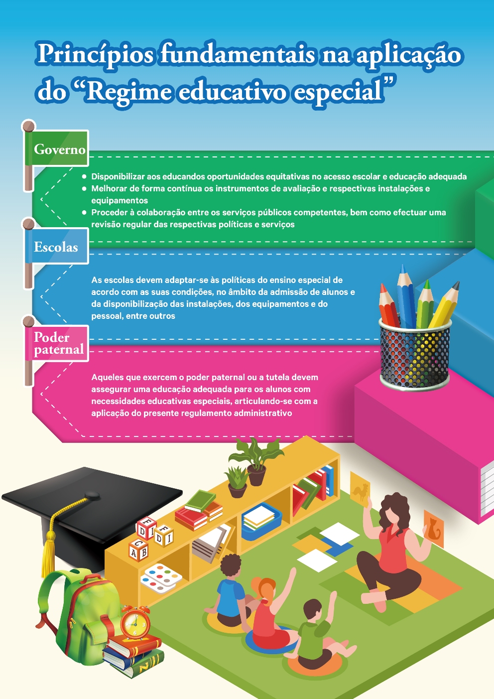O Decreto-Lei n.º 33/96/M, que regulariza o “Regime educativo especial”, tem vindo a ser implementado há mais de vinte anos, encontrando-se algumas das suas disposições já desarticuladas com as solicitações e o desenvolvimento do ensino especial de Macau. Para prestar um apoio eficaz aos alunos com necessidades educativas especiais e promover o desenvolvimento do ensino especial, o Governo da RAEM definiu o regulamento administrativo do “Regime do ensino especial”, regularizando e tornando ainda mais concretas as medidas de apoio aos alunos com necessidades educativas especiais (alunos com limitações físicas e psicológicas e alunos sobredotados).