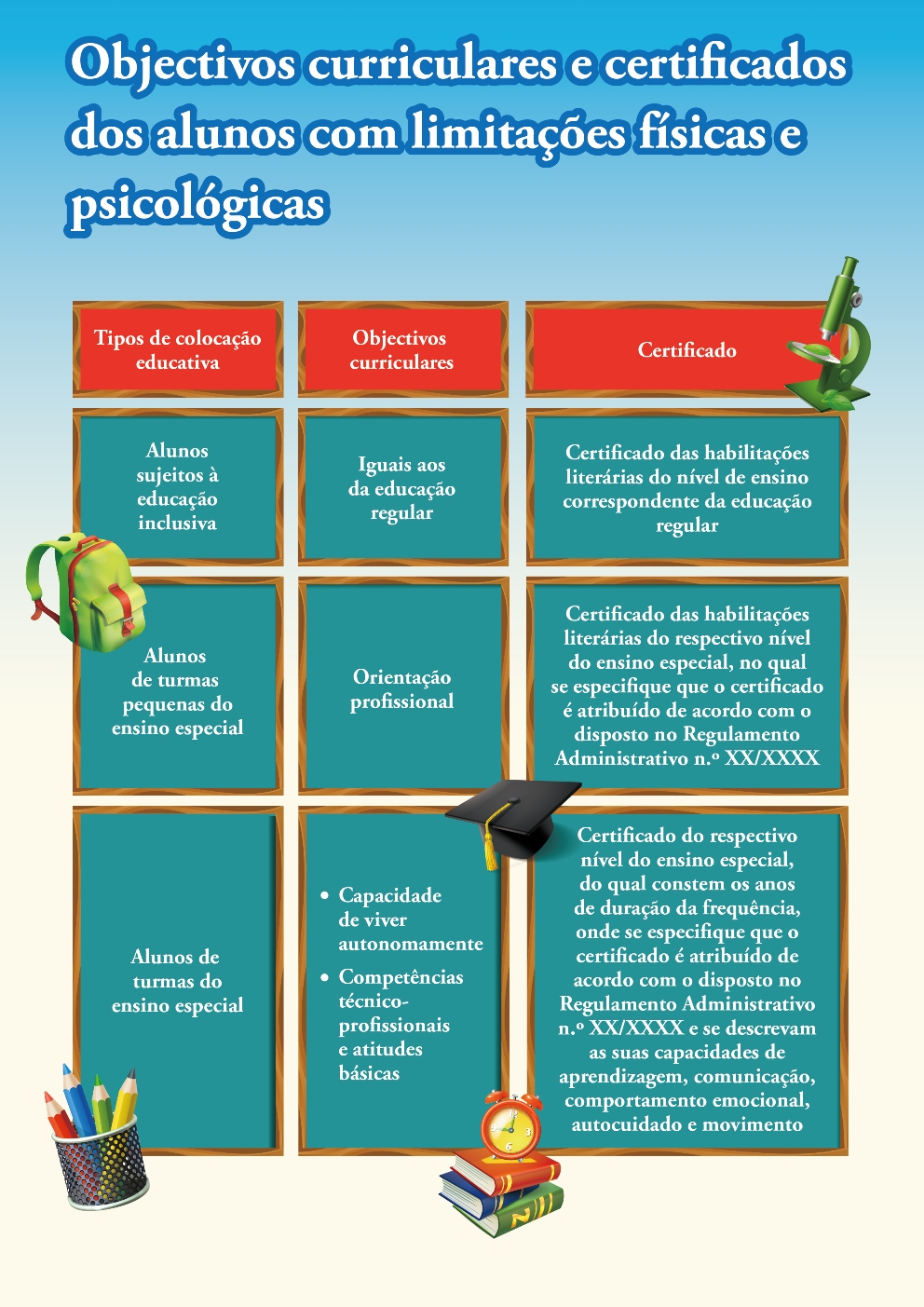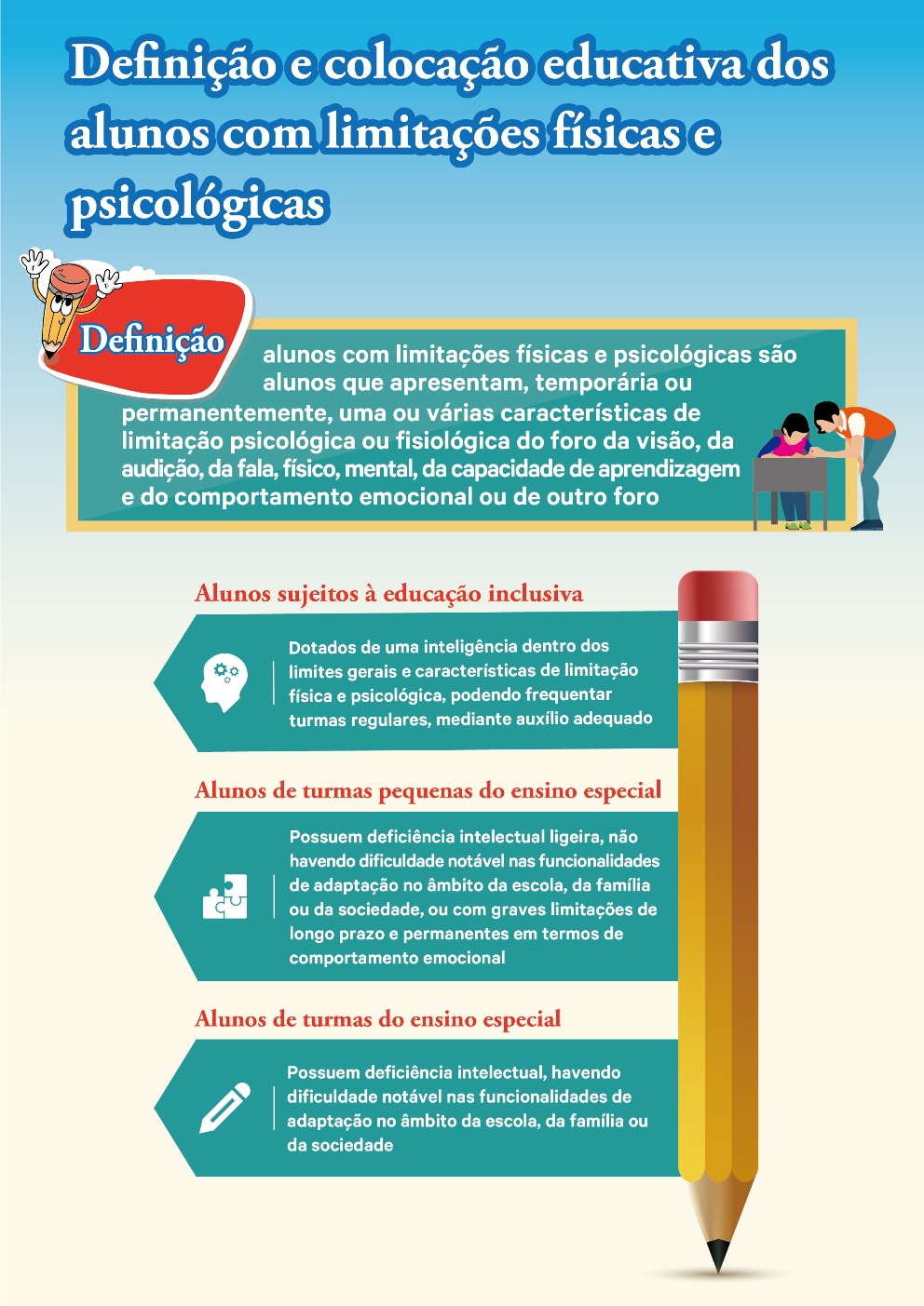 Em relação aos alunos com limitações físicas e mentais, o diploma legal divide-os em três tipos de alunos: alunos sujeitos à educação inclusiva, alunos de turmas pequenas do ensino especial e alunos das turmas do ensino especial. Os alunos sujeitos à educação inclusiva frequentam as turmas regulares; as turmas pequenas do ensino especial podem ser criadas nos diversos níveis de ensino das escolas regulares ou das escolas de ensino especial; as turmas do ensino especial podem ser criadas em todos os níveis de ensino, sendo a colocação dos alunos feita de acordo com a respectiva idade. Os objectivos curriculares, para os alunos sujeitos à educação inclusiva, são basicamente iguais aos da educação regular, enquanto os currículos das turmas pequenas do ensino especial têm o propósito de possibilitar, aos alunos, a aquisição de conhecimentos, e o desenvolvimento das capacidades e das atitudes fundamentais, factores imprescindíveis para que os mesmos se possam dedicar a determinada profissão. Os currículos das turmas do ensino especial, por sua vez, visam cultivar, nos alunos, a capacidade de viver autonomamente, competências técnico-profissionais e atitudes básicas. No diploma legal foi, também, definido o  conceito de “aluno sobredotado” e regulamentado que os alunos sobredotados devem frequentar as turmas dos diversos níveis de ensino da educação regular; além disso, foram também regulamentados os currículos e os certificados destes alunos, bem como o desenvolvimento da educação para alunos sobredotados.