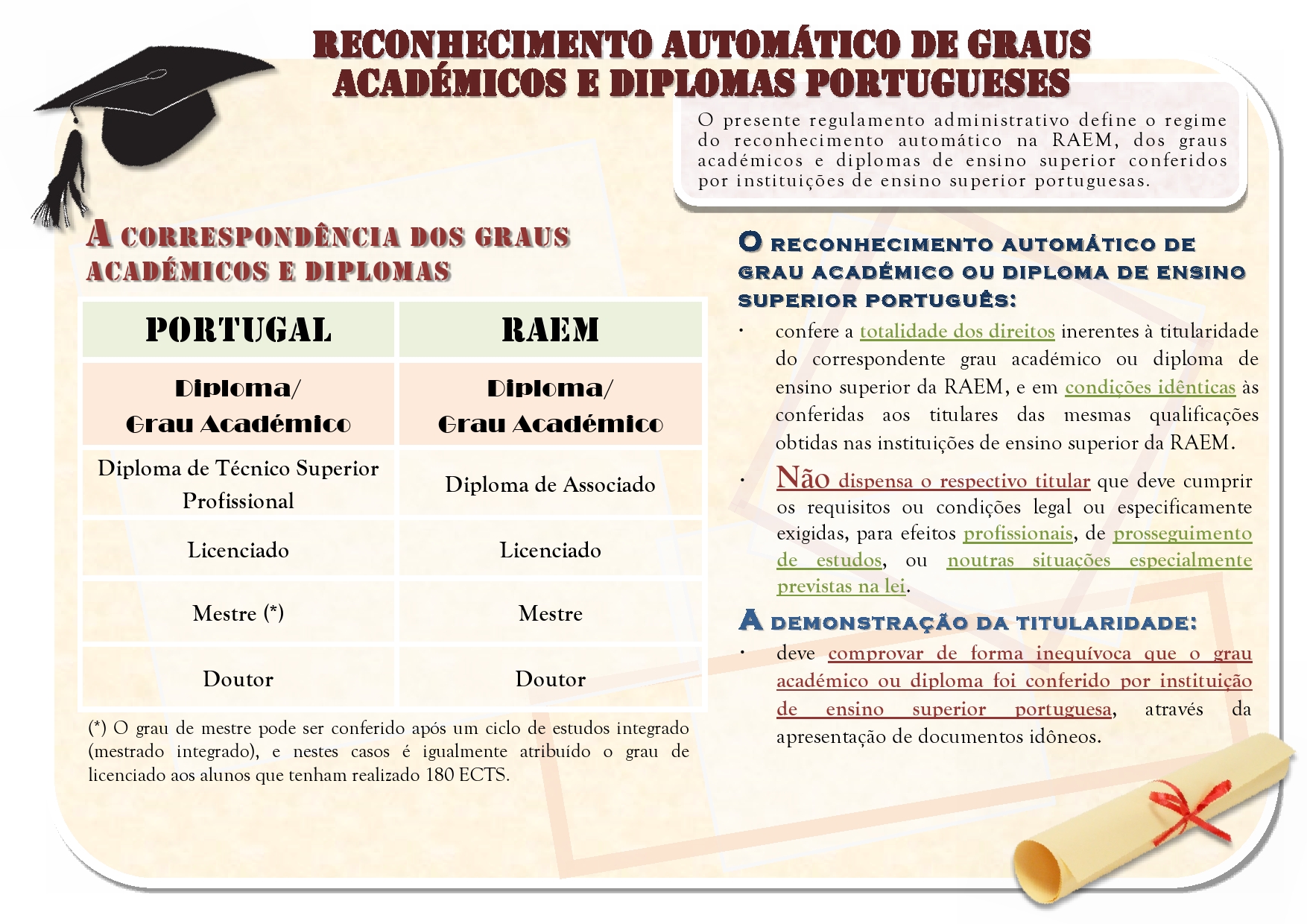 Para dar cumprimento às obrigações assumidas no Memorando de Entendimento entre o Governo da Região Administrativa Especial de Macau da República Popular da China e o Governo da República Portuguesa que Conduza ao Reconhecimento Automático de Diplomas e Graus Académicos, assinado a 15 de Maio de 2019 em Lisboa, bem como demonstrar o resultado da cooperação bilateral na área do ensino superior desenvolvida entre os Governos da RAEM e de Portugal, o Governo da RAEM elaborou o regulamento administrativo intitulado “Reconhecimento automático de graus académicos e diplomas portugueses”.